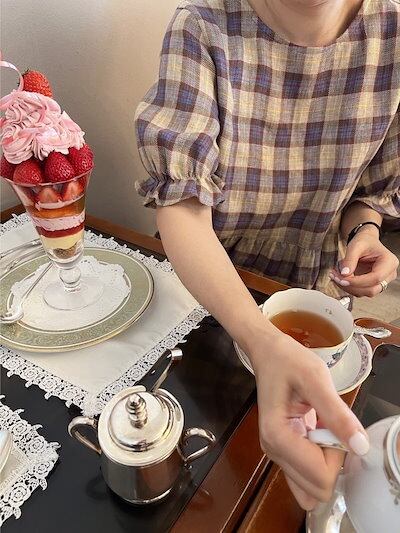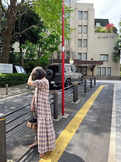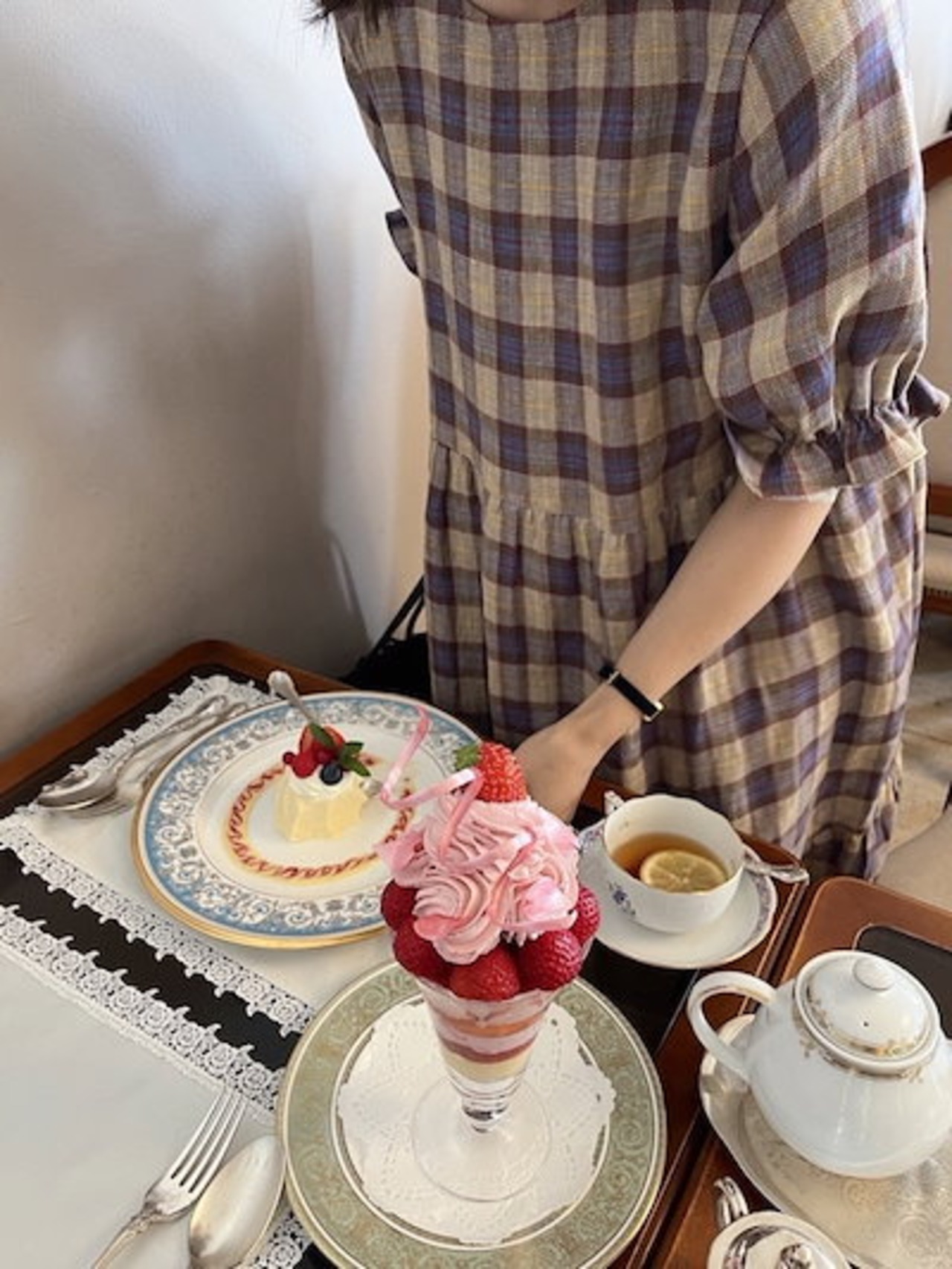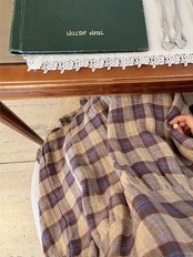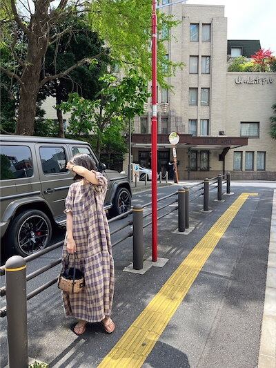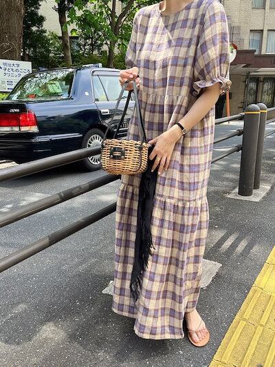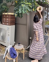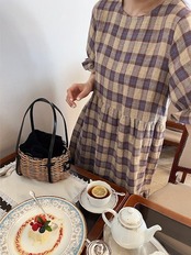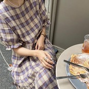 2024 夏 韓国ワンピース ロング丈 レトロ ラウンドネック 半袖 バブル袖 チェック柄 Aライン ゆったり 細見え 夏 紫 パープル カジュアル おしゃれ かわいい キュート 韓国ファッション レ