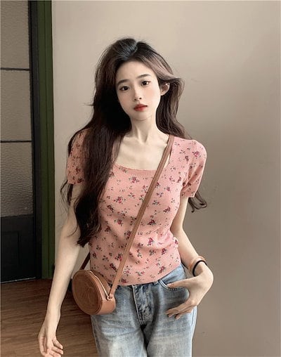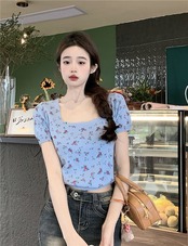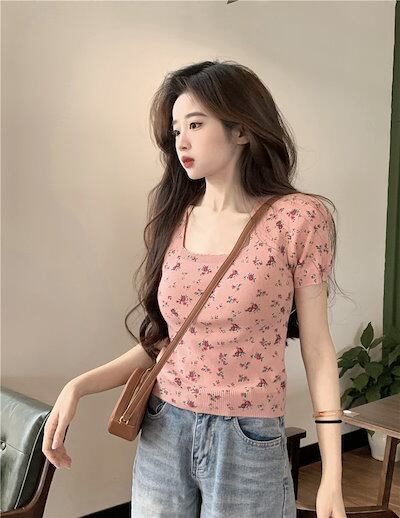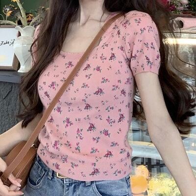 2024 夏 韓国トップス Tシャツ 半袖 スクエアネック 花柄 丈短め ショート スリム 夏 白 青 かわいい おしゃれ ガーリー キュート 甘め カジュアル 韓国ファッション レディース お出かけ