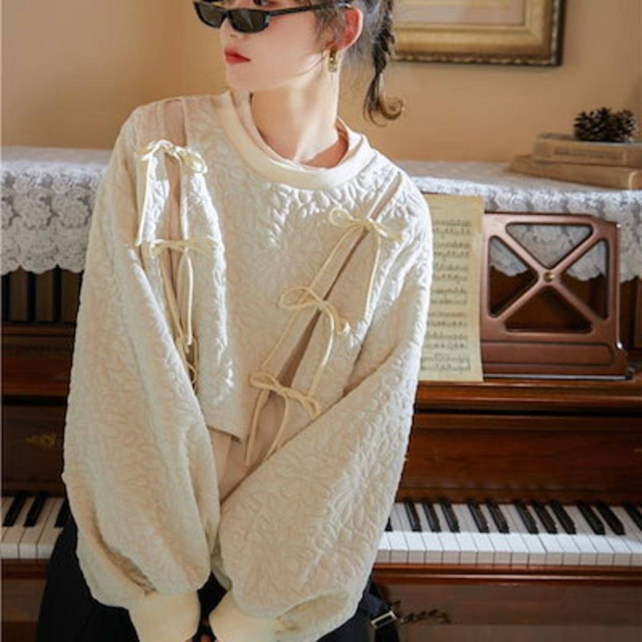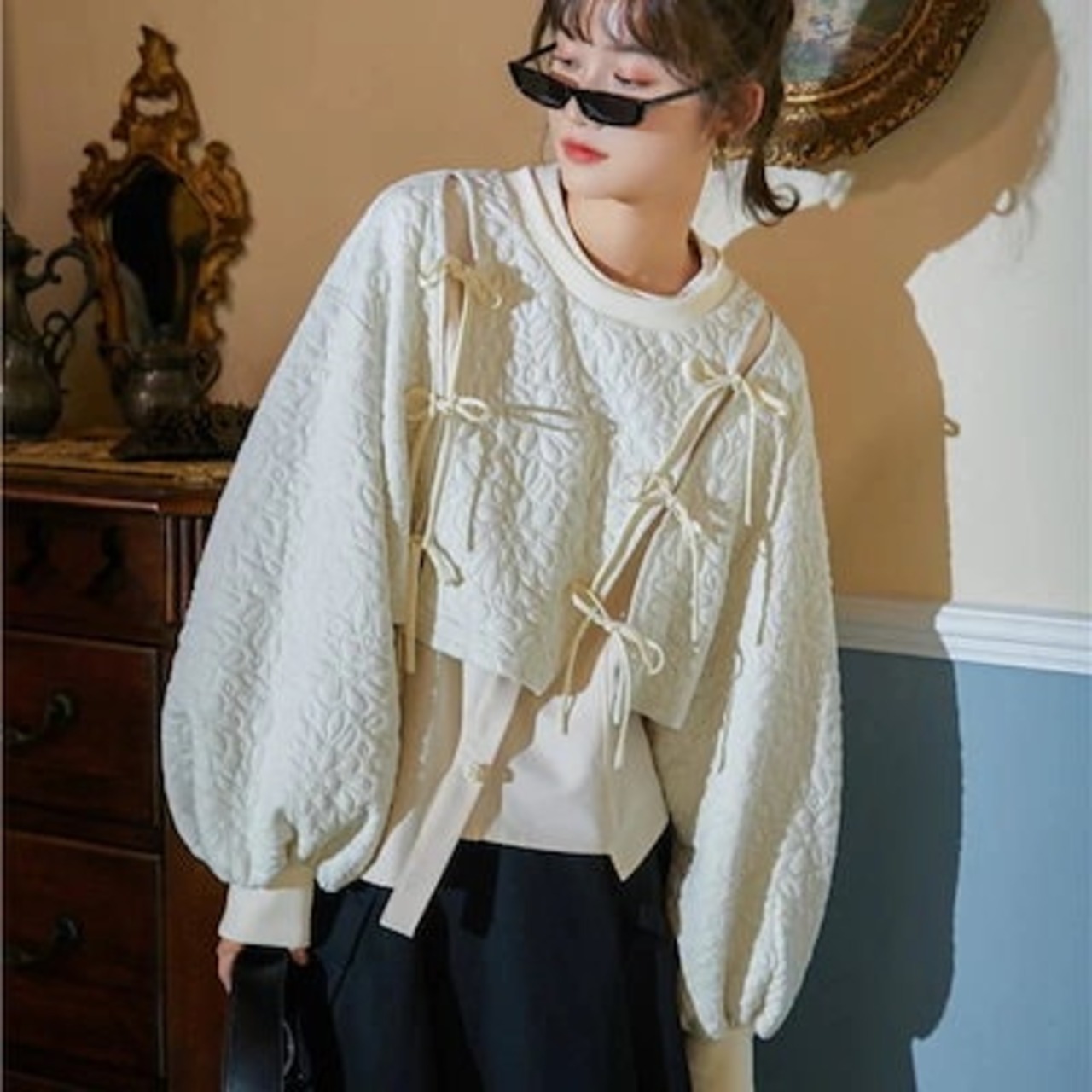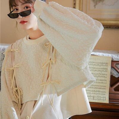 2024 秋冬 トップス ?トレーナー かわいい カジュアル花ラウンドネックT シャツ女っぽ ショートプルオーバーファッション系 きれいめスリーブ 大人っぽ 上品 パーカー フェミニンフレンチお出かけ