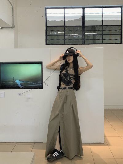 2024 春夏スカート ロング丈 Aライン スリット フロントオープン ハイウエスト 美脚効果 脚長効果 細見え 夏 カーキ おしゃれ かわいい 韓国ファッション レディース お出かけ