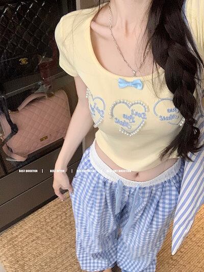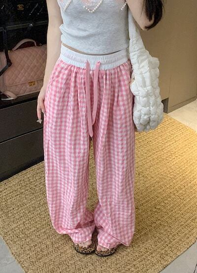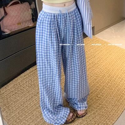 2024 春夏パンツ ロング丈 モップパンツ ギンガムチェック ワイド ストレート ウエストゴム ハイウエスト 美脚効果 脚長効果 細見え 夏 青 韓国ファッション レディース かわいい おしゃれ カ
