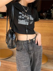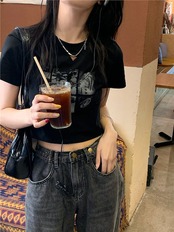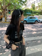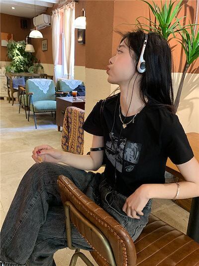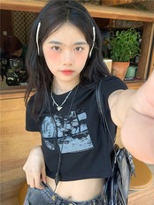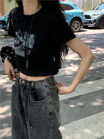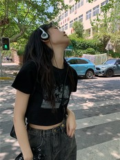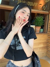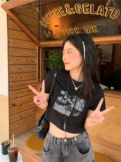 2024 春夏 甘い トップス Tシャツ ラウンドネック 休日 ファッション スリムフィット丈短め ショートサイズスリーブ レディース へそ出しシルエット 韓国 休日 おしゃれ T