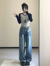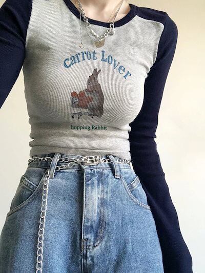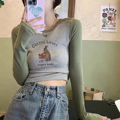2024春夏 トップス 長袖 可愛い おしゃれ タイトフィット ラウンドカラー 重ね着丈 スリーブ 女っぽ Tファッション フェミニン きれいめ 色っぽ プリント