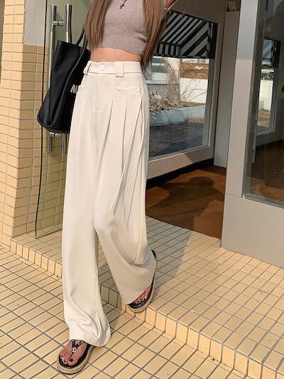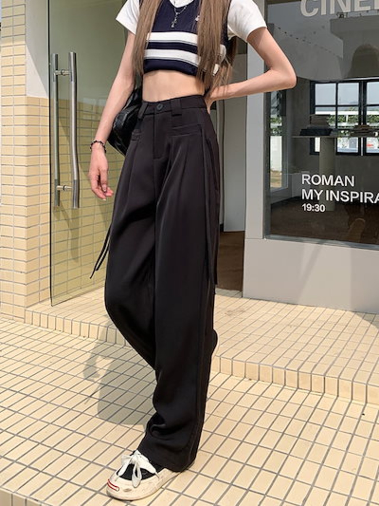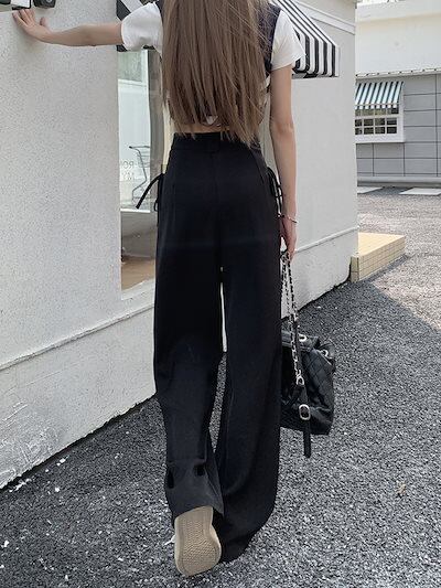 2024 春夏パンツ ロング丈 ワイド リボン ハイウエスト 美脚効果 脚長効果 細見え 夏 黒 茶色 白 おしゃれ かわいい ガーリー 甘め 韓国ファッション レディース お出かけ