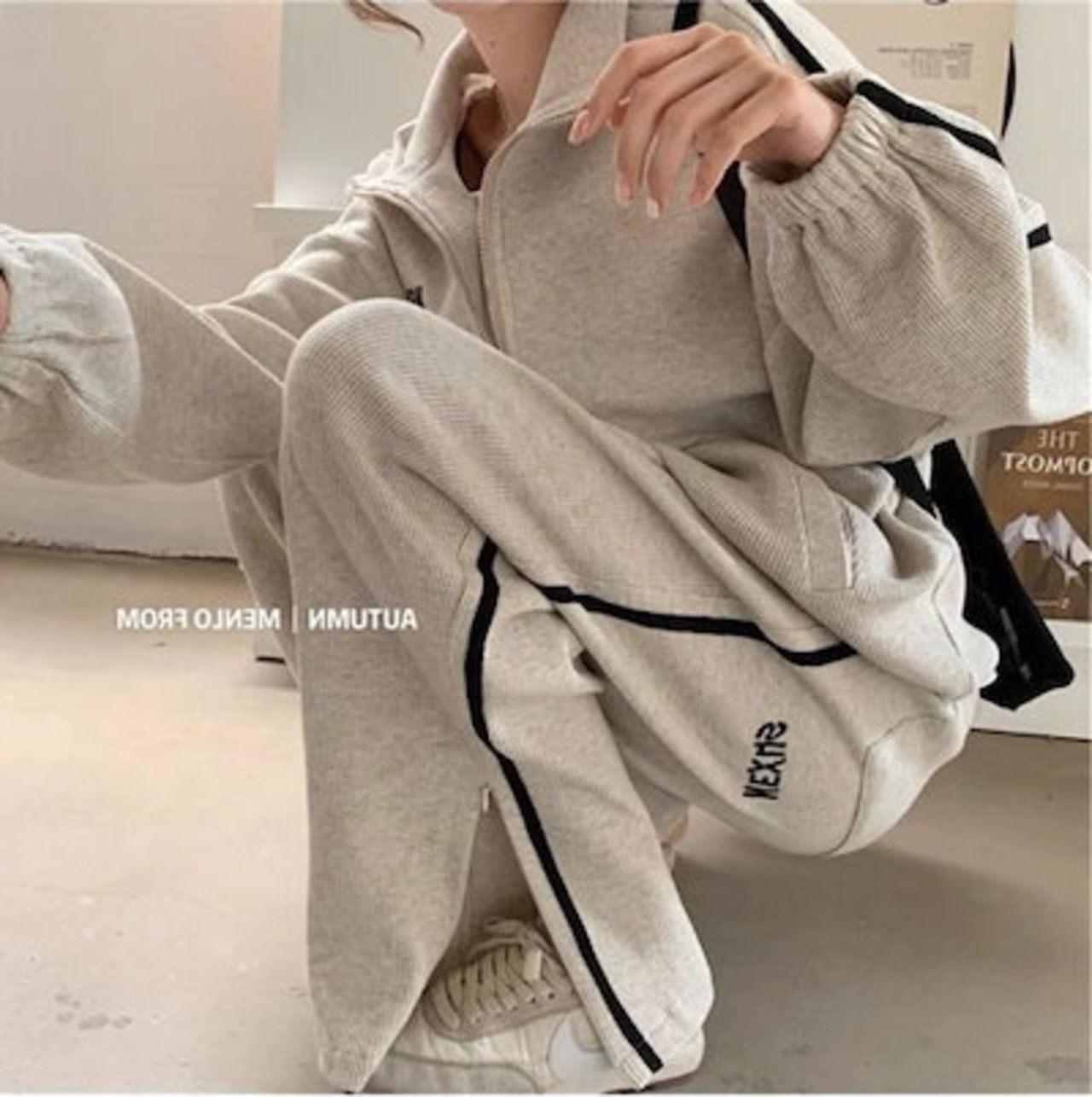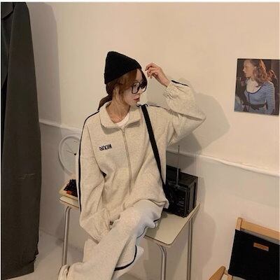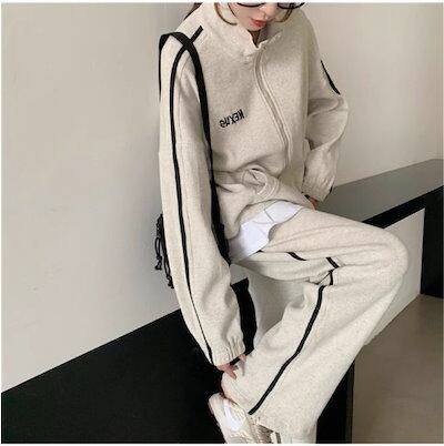 2024 春秋 2点セット トップス お出かけ 羽織り ショート丈 セットアップ フルラウンドヘム ルーズ サイド ボトムス ストレート系冬 ゆったり サイズワイドシルエット リラックストラック