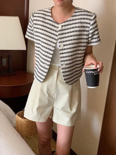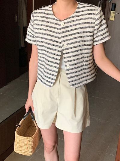 2024秋冬アウター ジャケット ラウンドネック ボーダー 半袖 ボタン 秋 黒 青 水色 ライトブルー おしゃれ かわいい 韓国ファッション レディース お出かけ