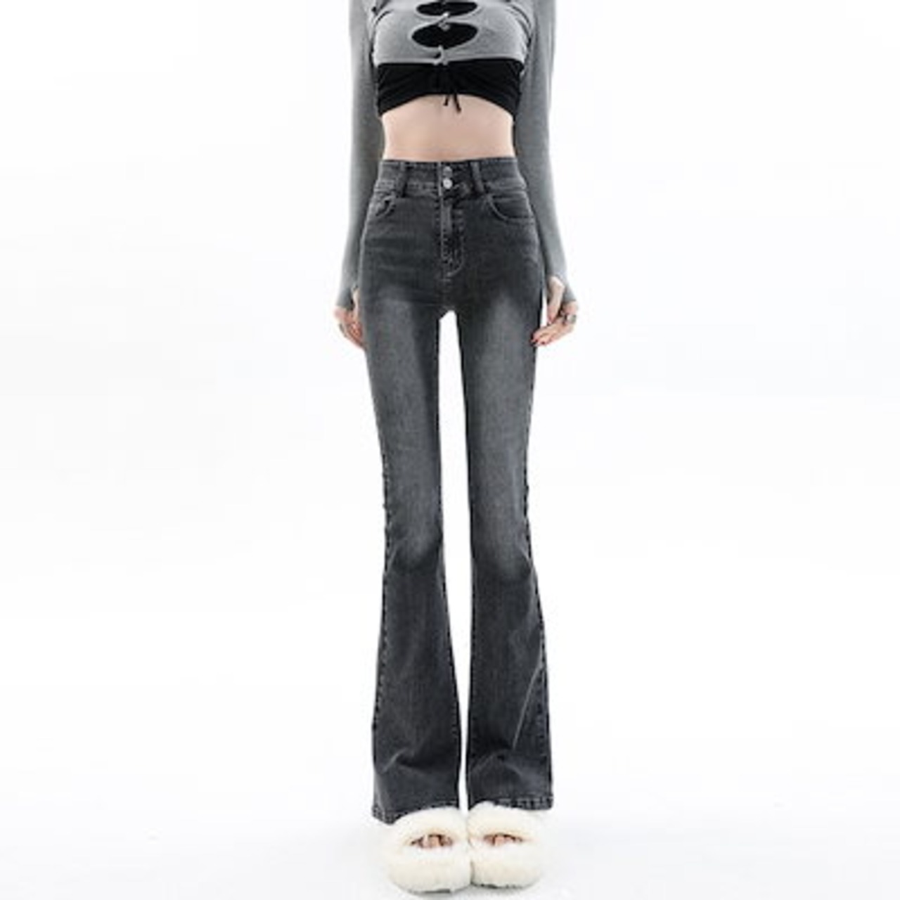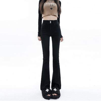 人气 新作 デニムパンツ スモークグレー ジーンズ レディース 春秋 ストレッチ 9つのポイント フレアパンツ