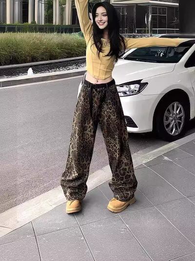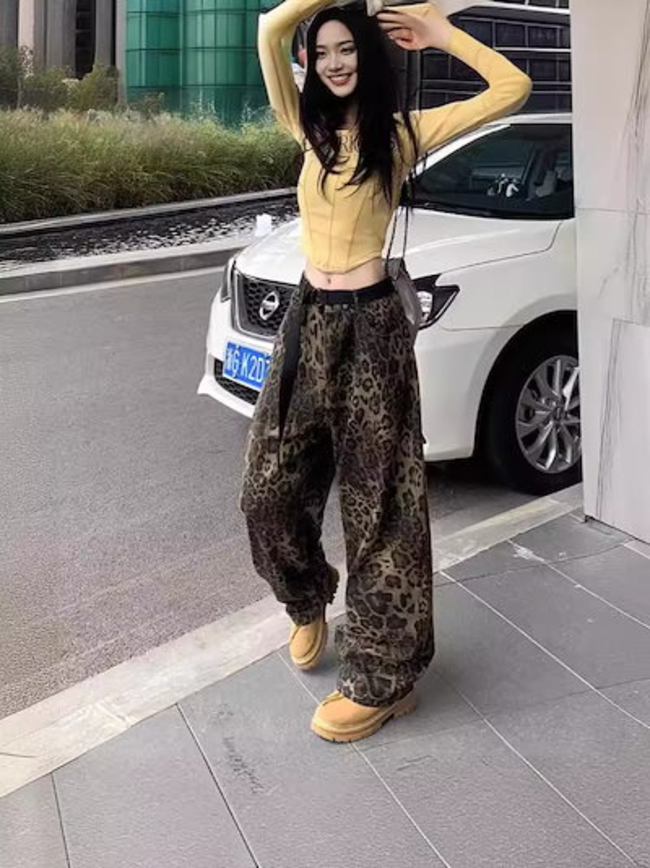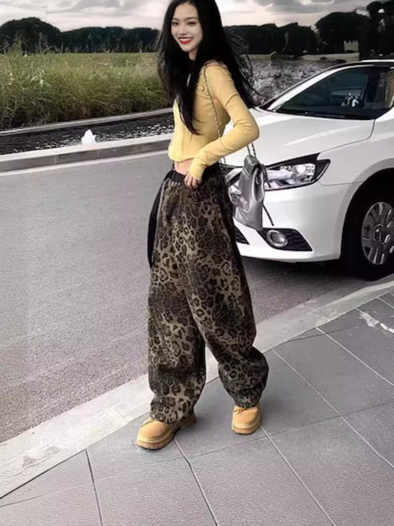 ワイドパンツ ヴィンテージ ヒョウ柄 ジーンズ 男女 秋 ドレープ ストレートパンツ ルーズ ワイドパンツ
