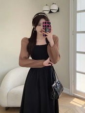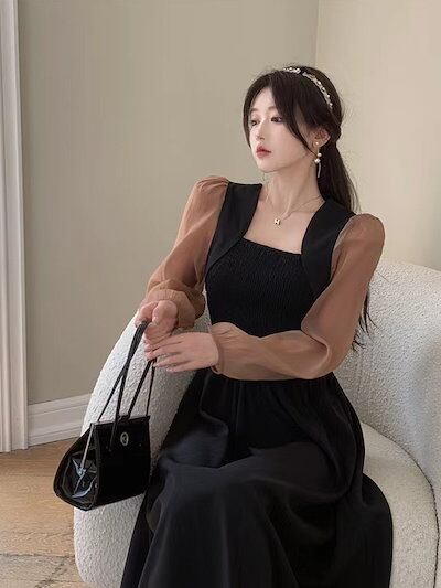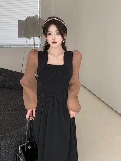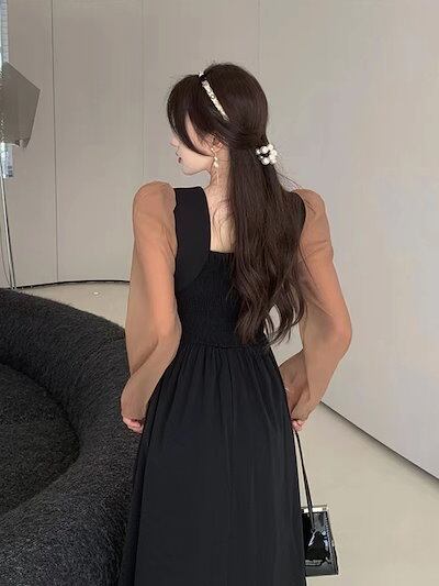 ワンピース エレガント ロングスリーブ ワンピース 2024 秋 新しいスタイル スクエアネック 薄手 ドレス
