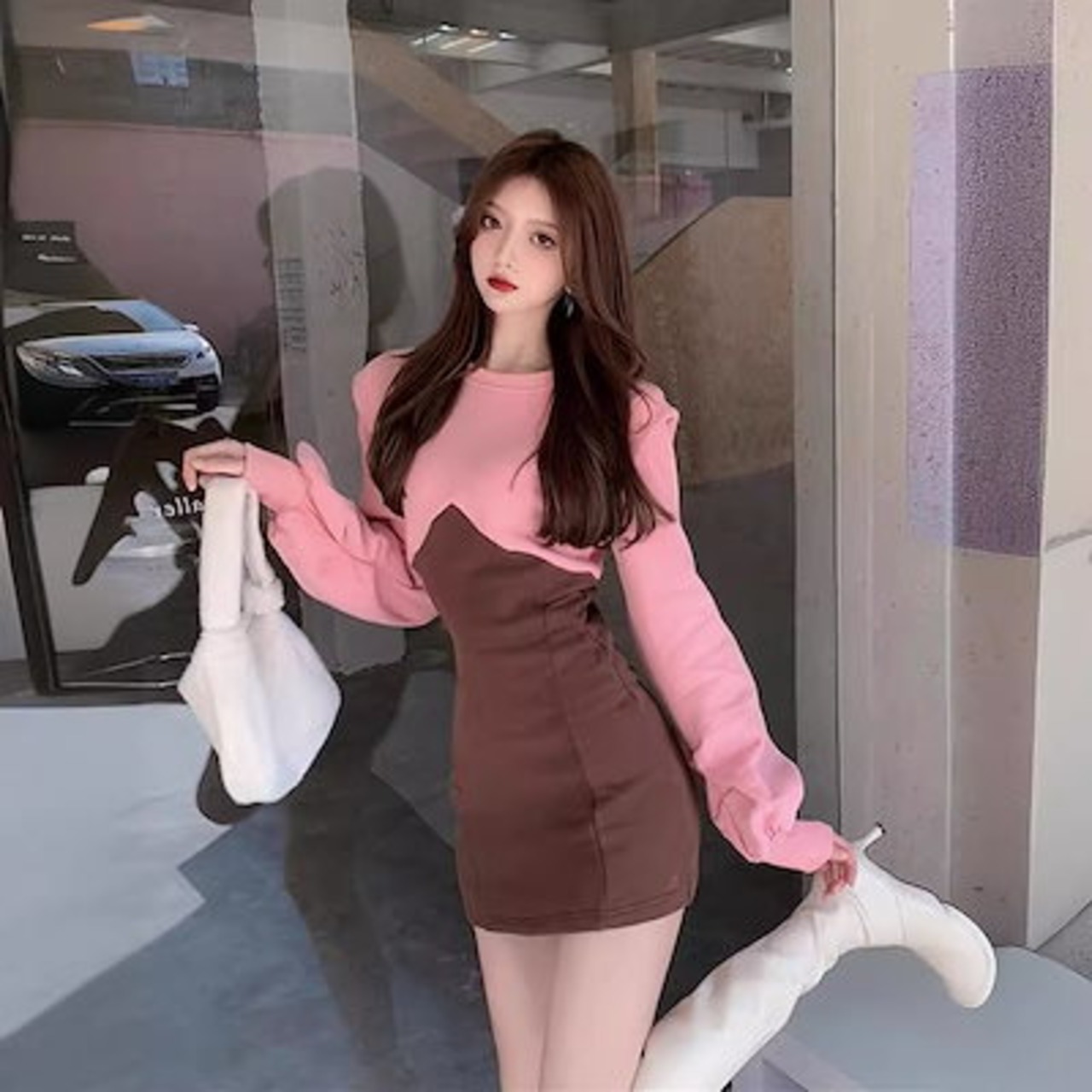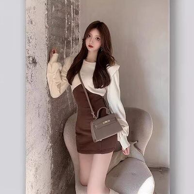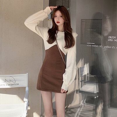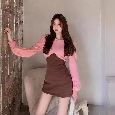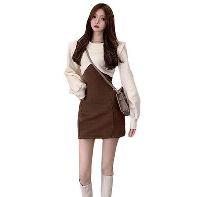 ワンピース ラウンドネック ロングスリーブ パッケージヒップドレス 2024 秋 新しいスタイル パッチワーク ドレス レディース