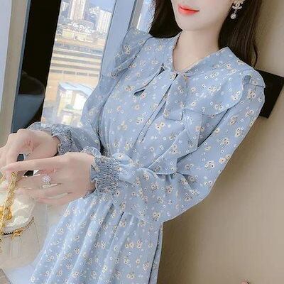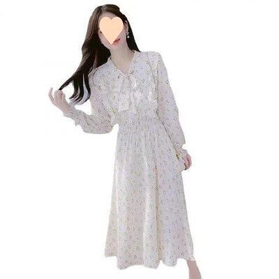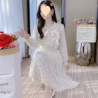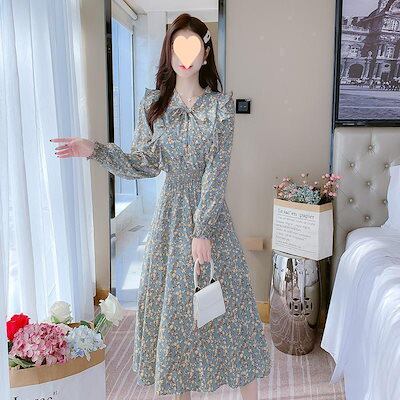 人气 新作長袖ロング マキシ丈ワンピ フリルエッジ 花柄ワンピース 2024秋 新しいスタイル リボンタイ ロングドレス