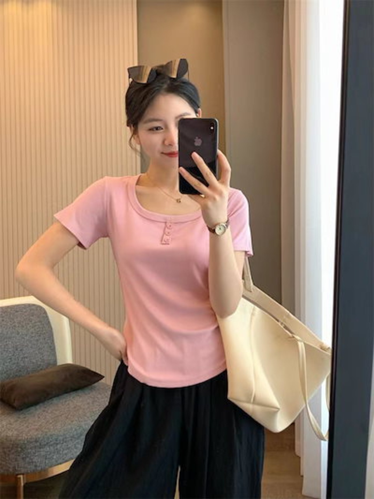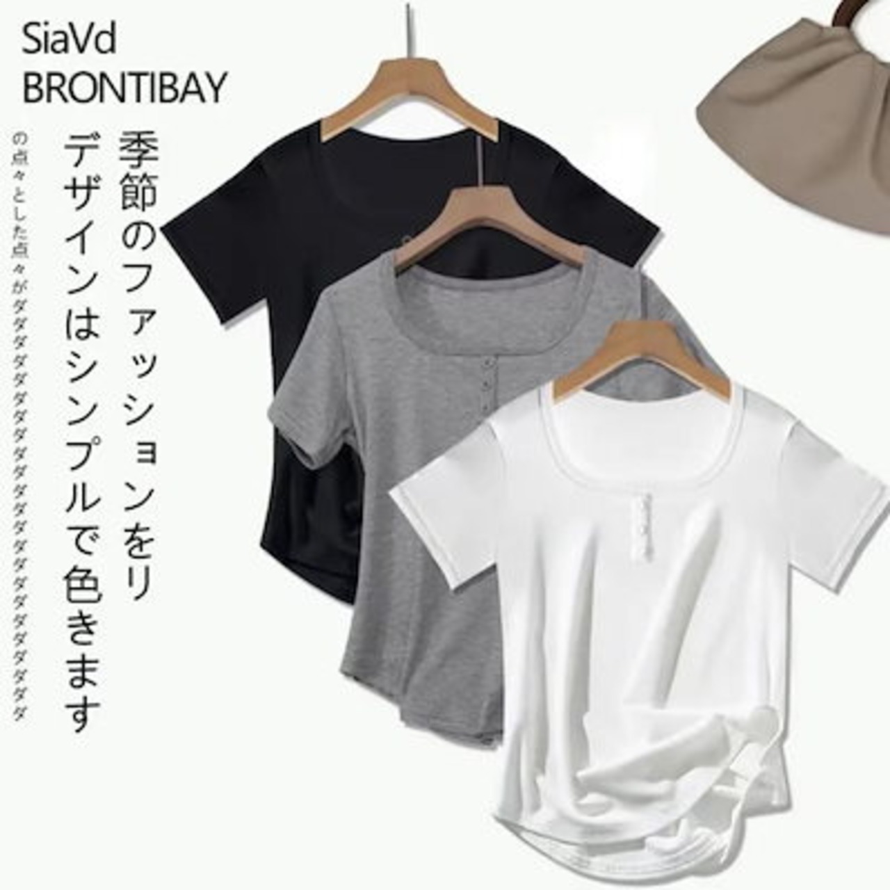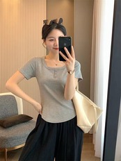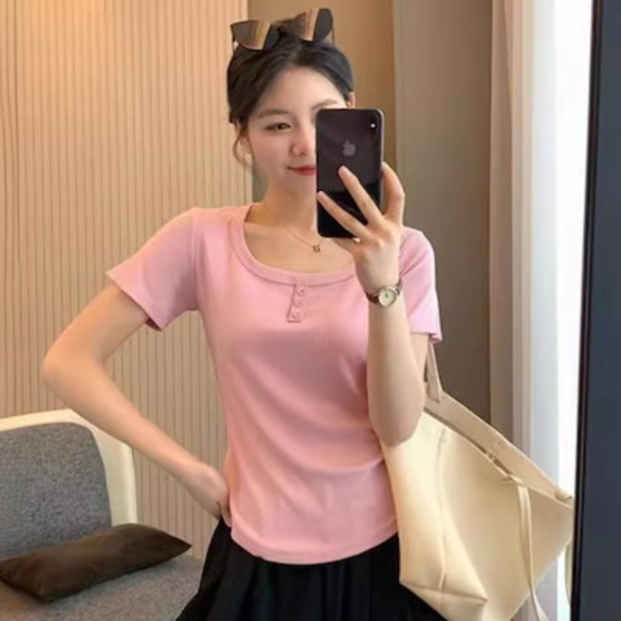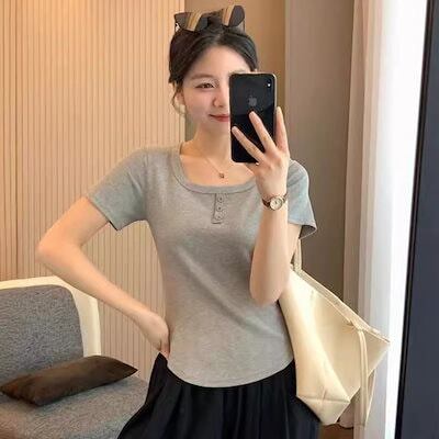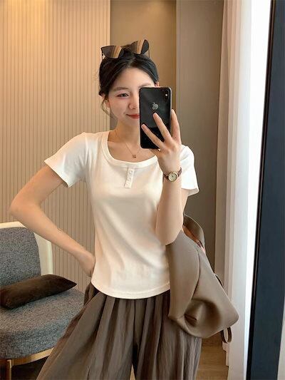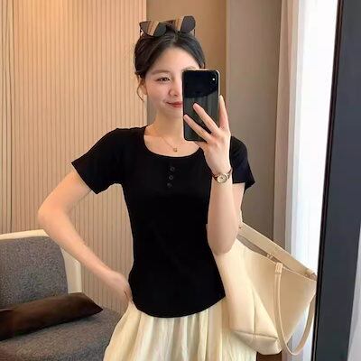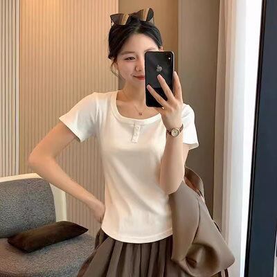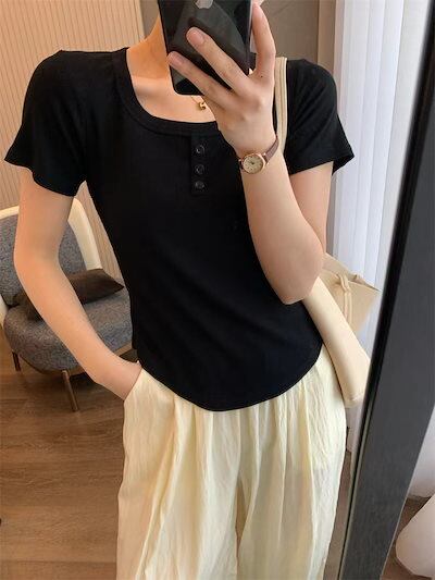 Tシャツ スクエアネック ショート丈 アーク裾 デザイン感 夏のストレッチスリムボタン 半袖 トップス レディース 韓国