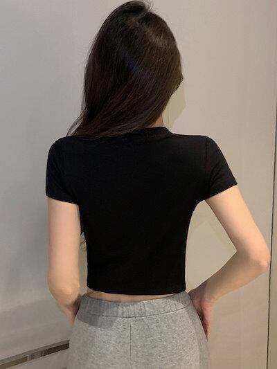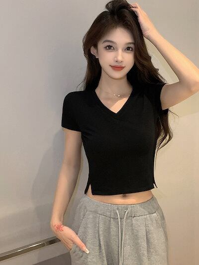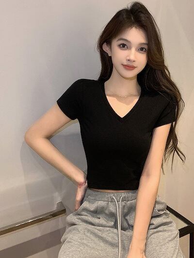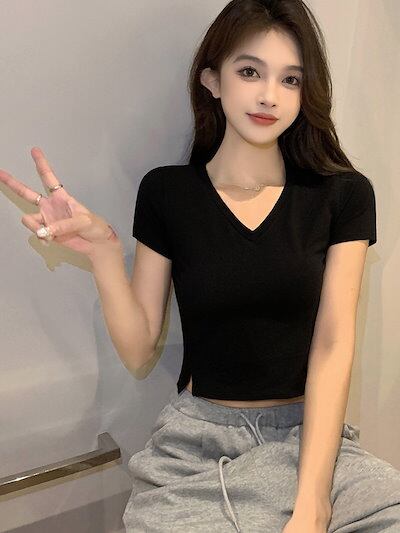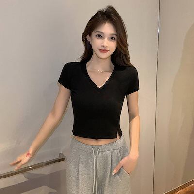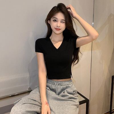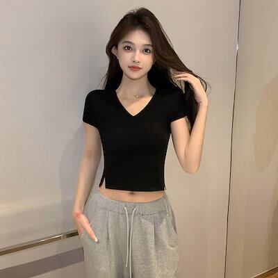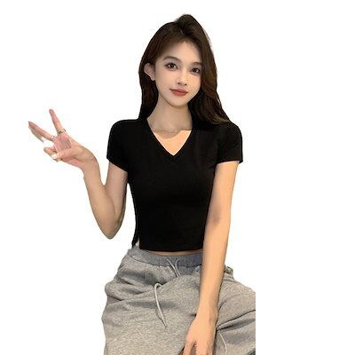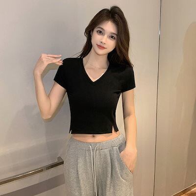 Tシャツ トップス v襟 2024新型 夏 小柄 半袖 開叉 修身 スリム ショート丈 タイツ レディース 韓国