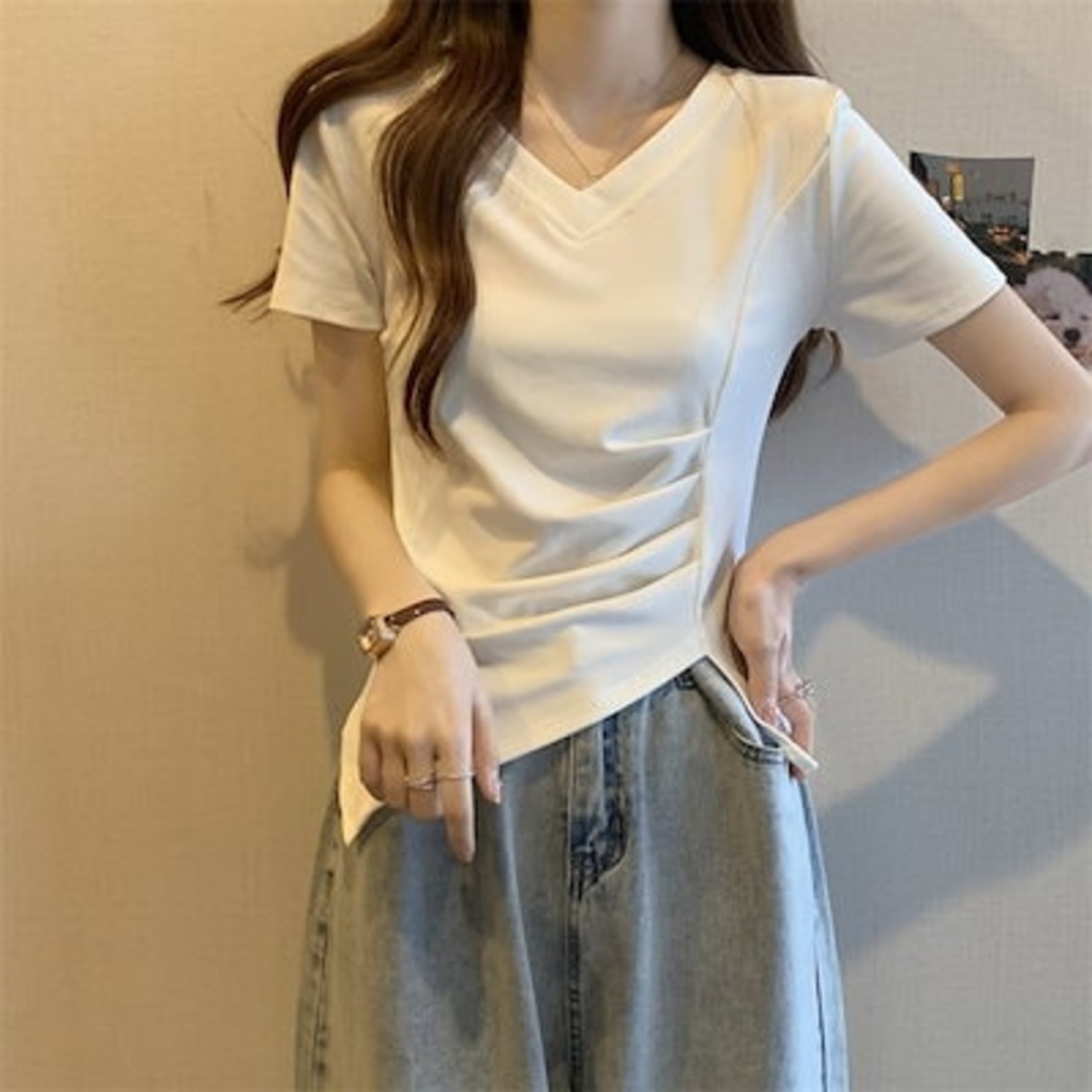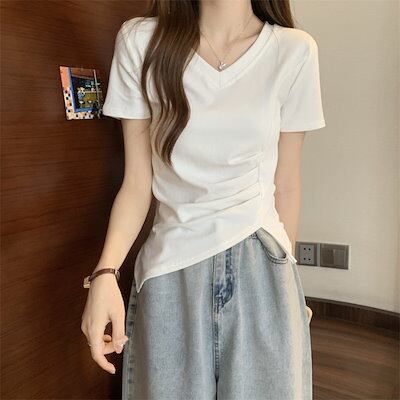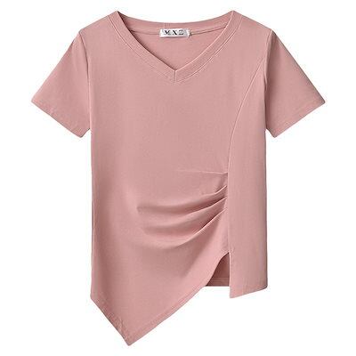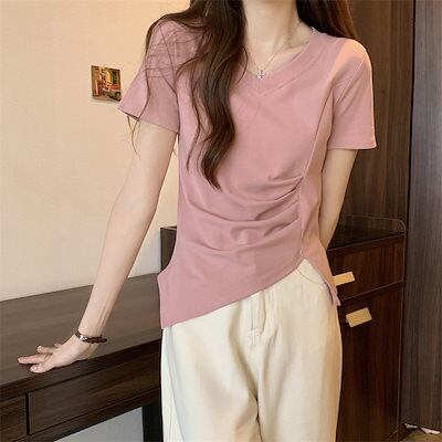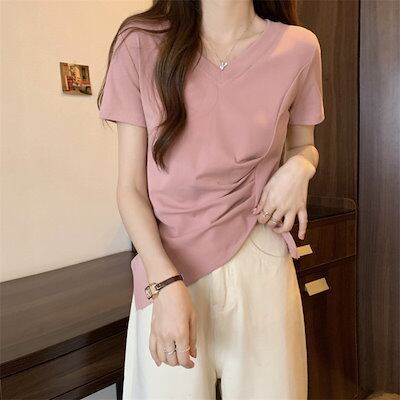 Tシャツ 2024新型 Vネック 半袖 夏 デザインしわ 収縮 ウエスト 開叉 不規則 トップス レディース 韓国