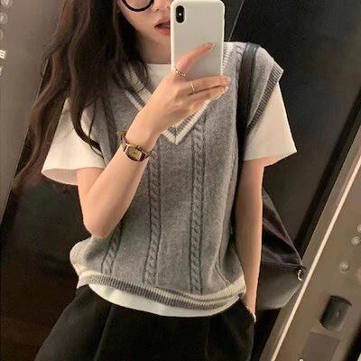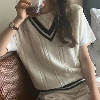 ベスト 2024 秋冬 アウター ベスト カレッジ スタッキング ジャンパー セーター カラーブロッキング Vネック ニットベスト レディース 韓国ファッション