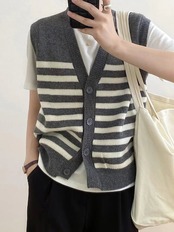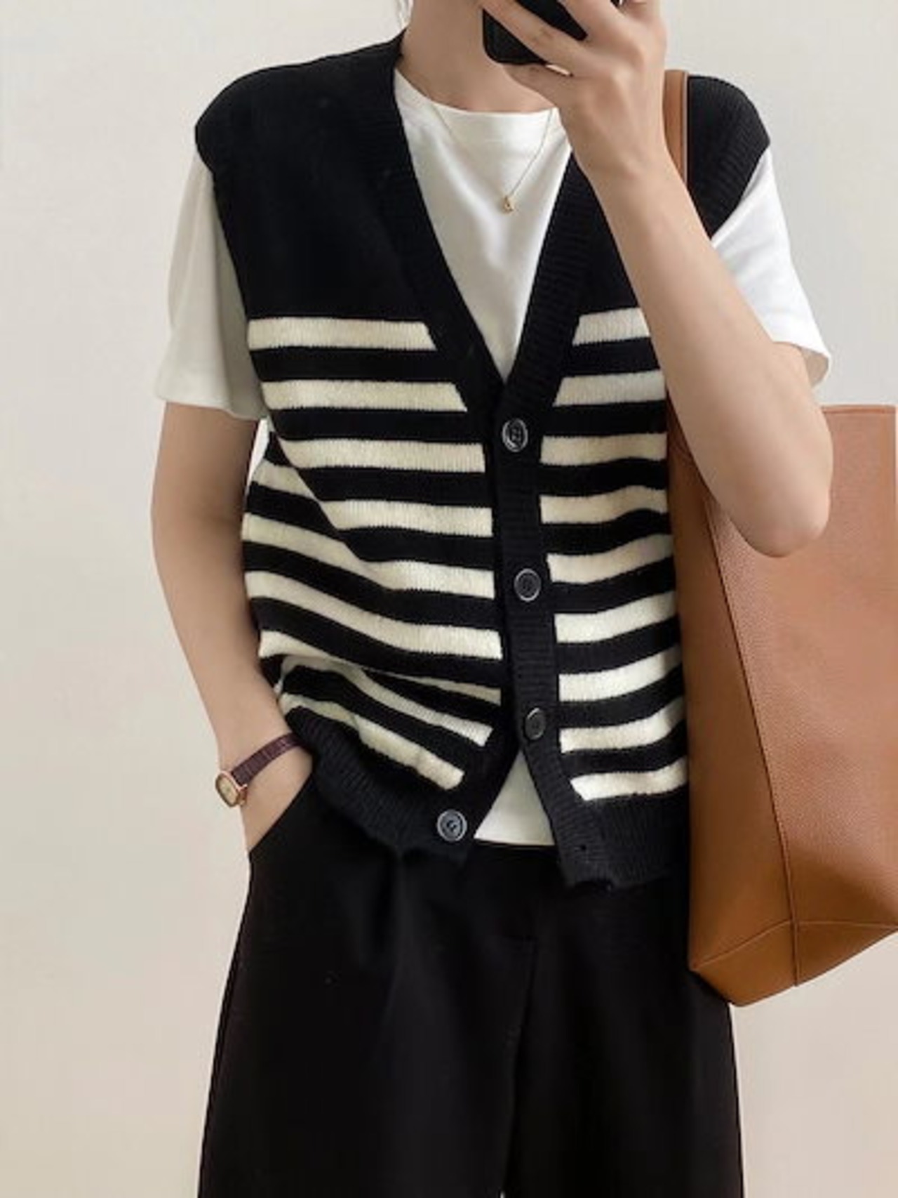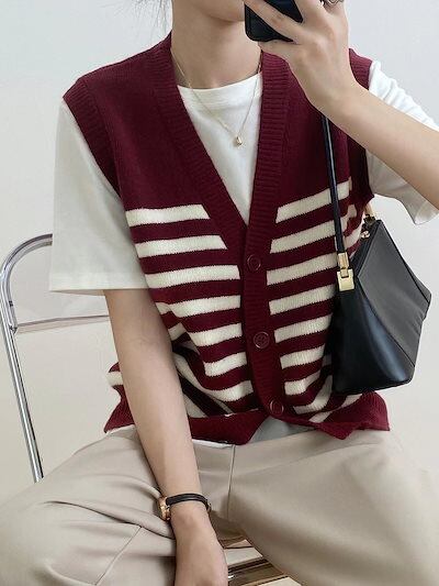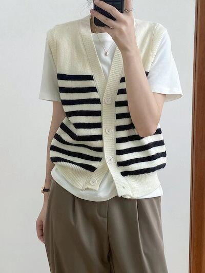 ベスト ノースリーブベスト ジャンパー ストライプ Vネック 2024 初秋 ニット カーディガン レディース アウターウェア トップスト 可愛い ベスト 韓国ファッション