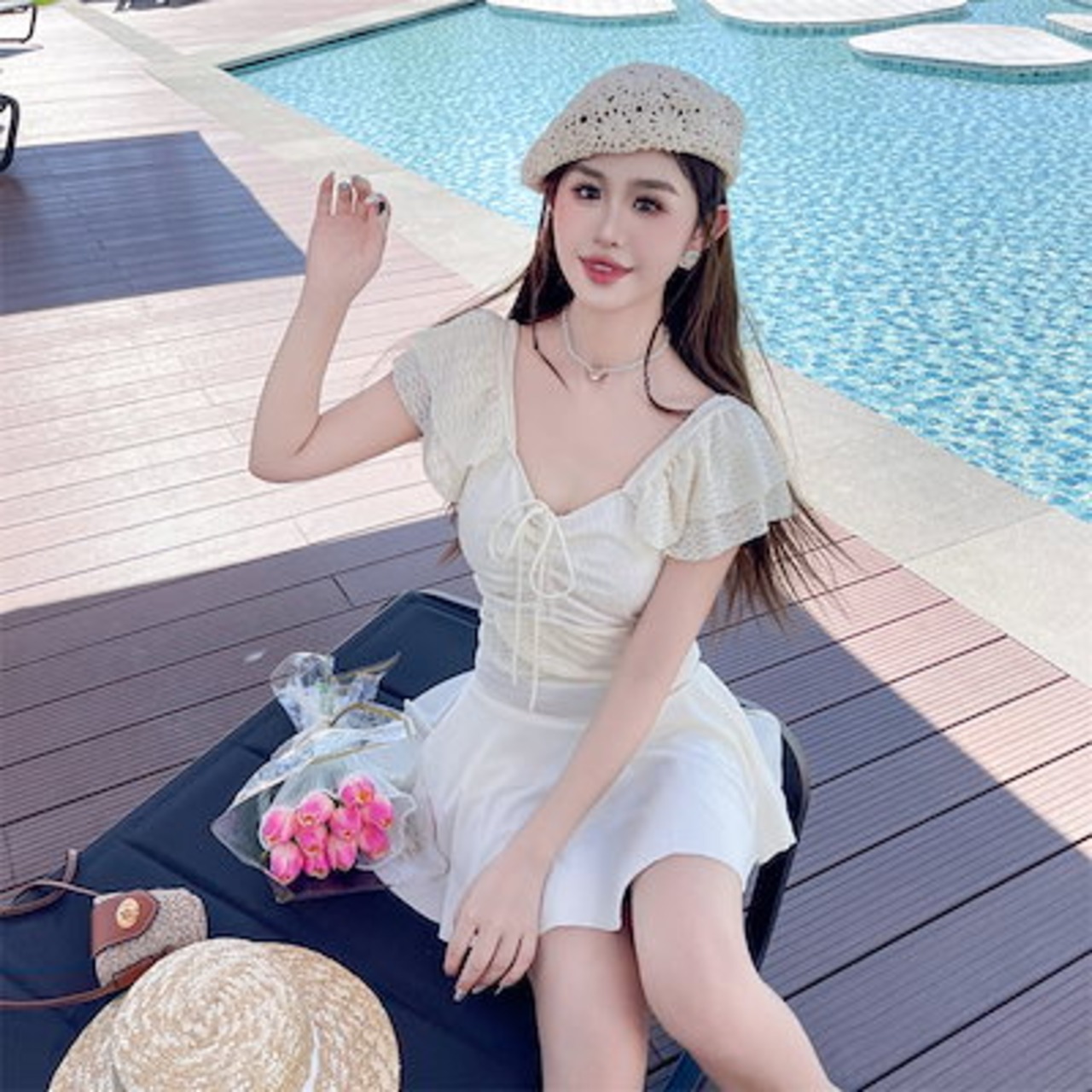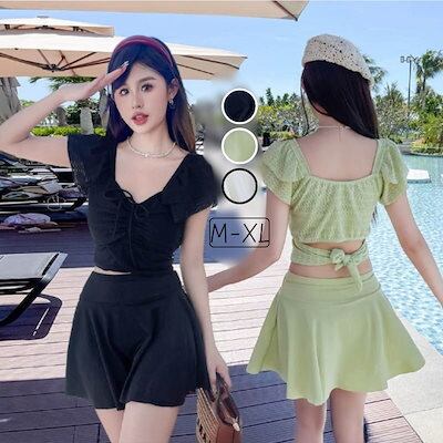 【3日以内出荷】水着 ワンピース 2024 スプリット ツーピース プレーン 半袖 ライトウェイト 休日 スパ 体型カバー 韓国