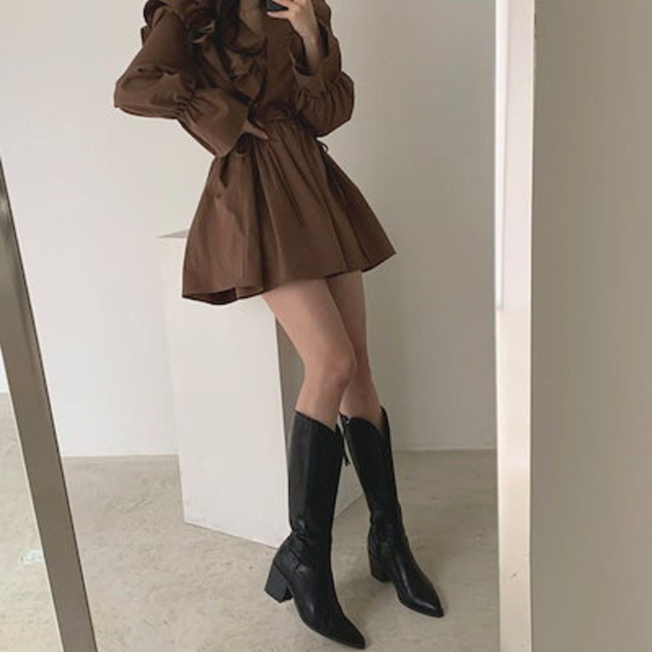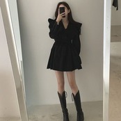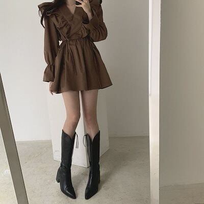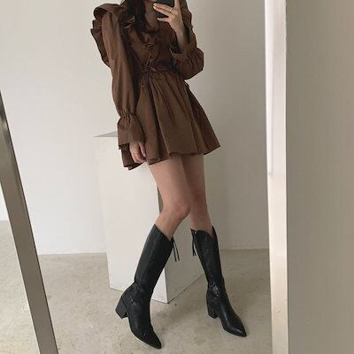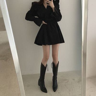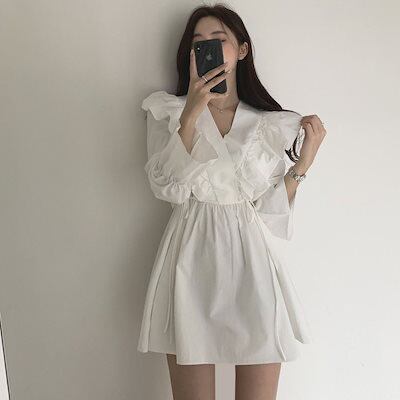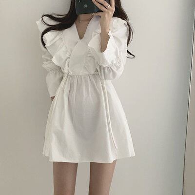 韓国ChicレトロVネック ワンピース レディース デザイン感 小柄 早秋 ファッション