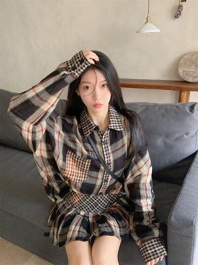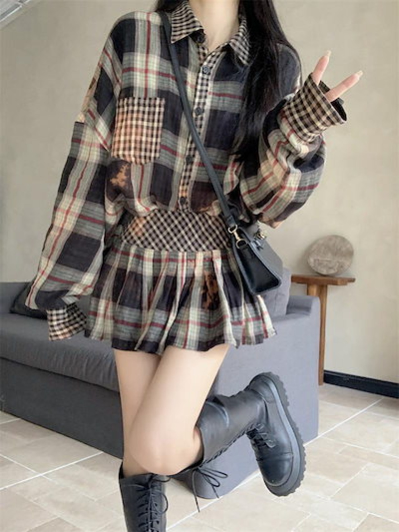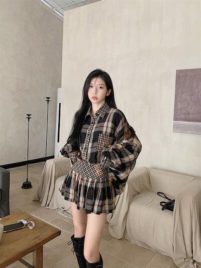 ゆったりレトロチェックシャツ ワンピース レディース 2点セット 通勤 OL 早秋 韓国ファッション