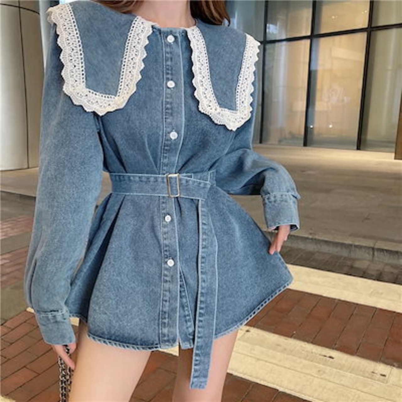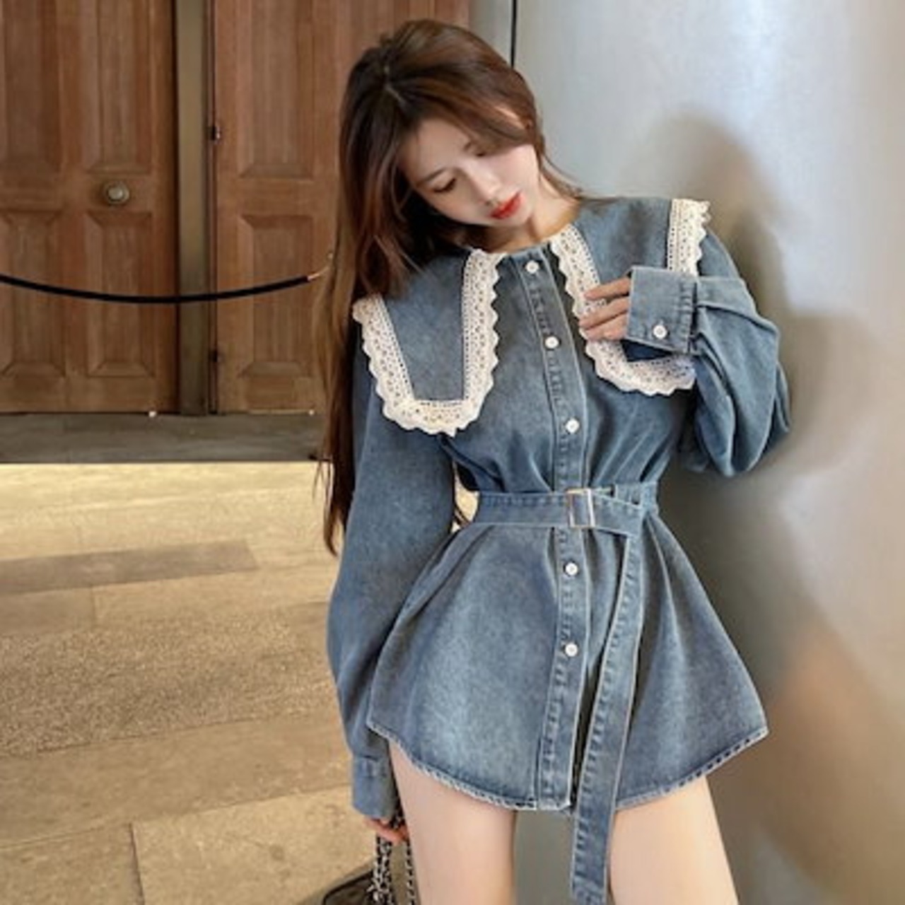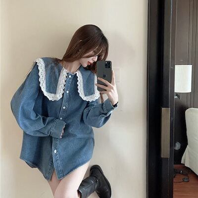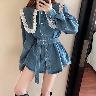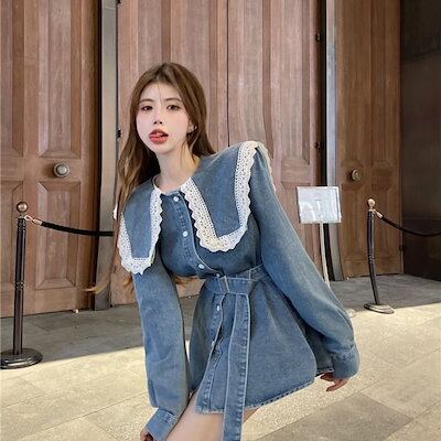 デニムワンピース レディース OL 早秋 韓国ファッション レースドールネック長袖シャツスカート