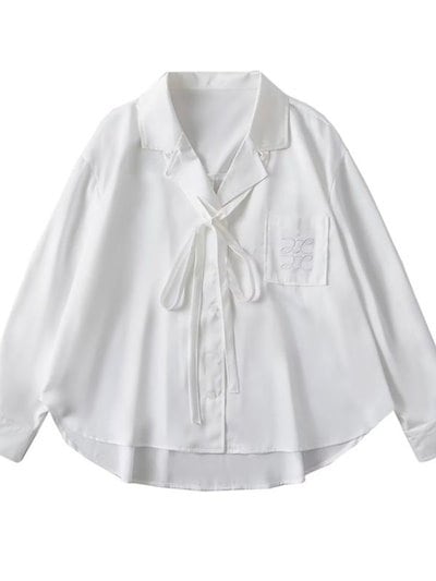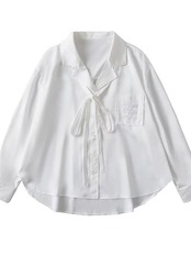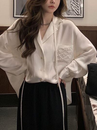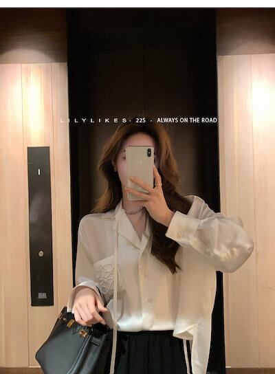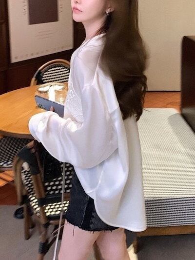 2024秋 ホワイト サテン 長袖シャツ 今っぽシアーシャツ 通勤 フレンチ v襟 シック トップス