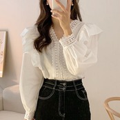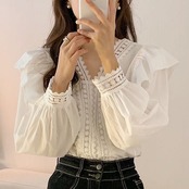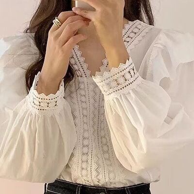 2024秋の新作 今っぽシアーシャ ツゆったりカジュアル レース フランス シャツ トップスvネック 通勤 上品