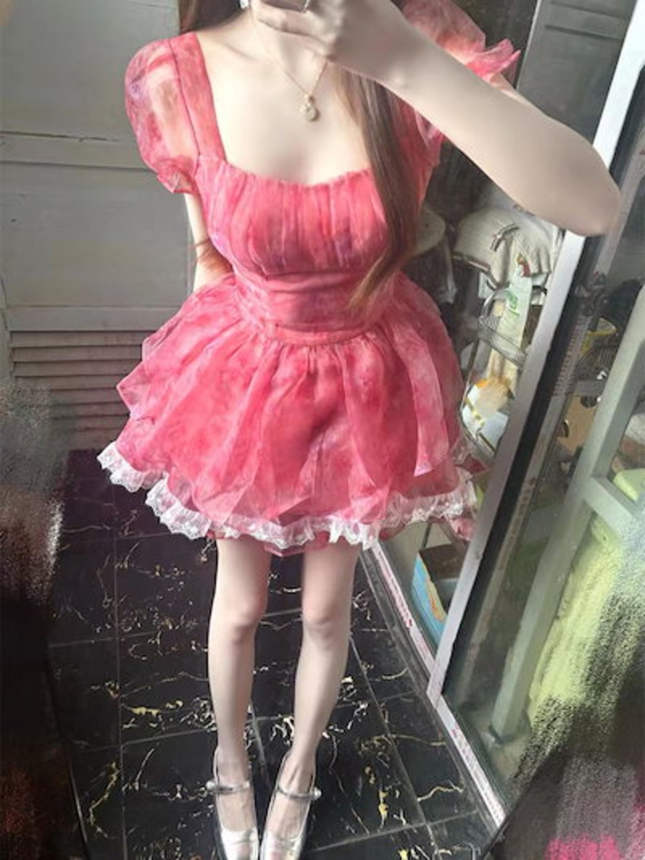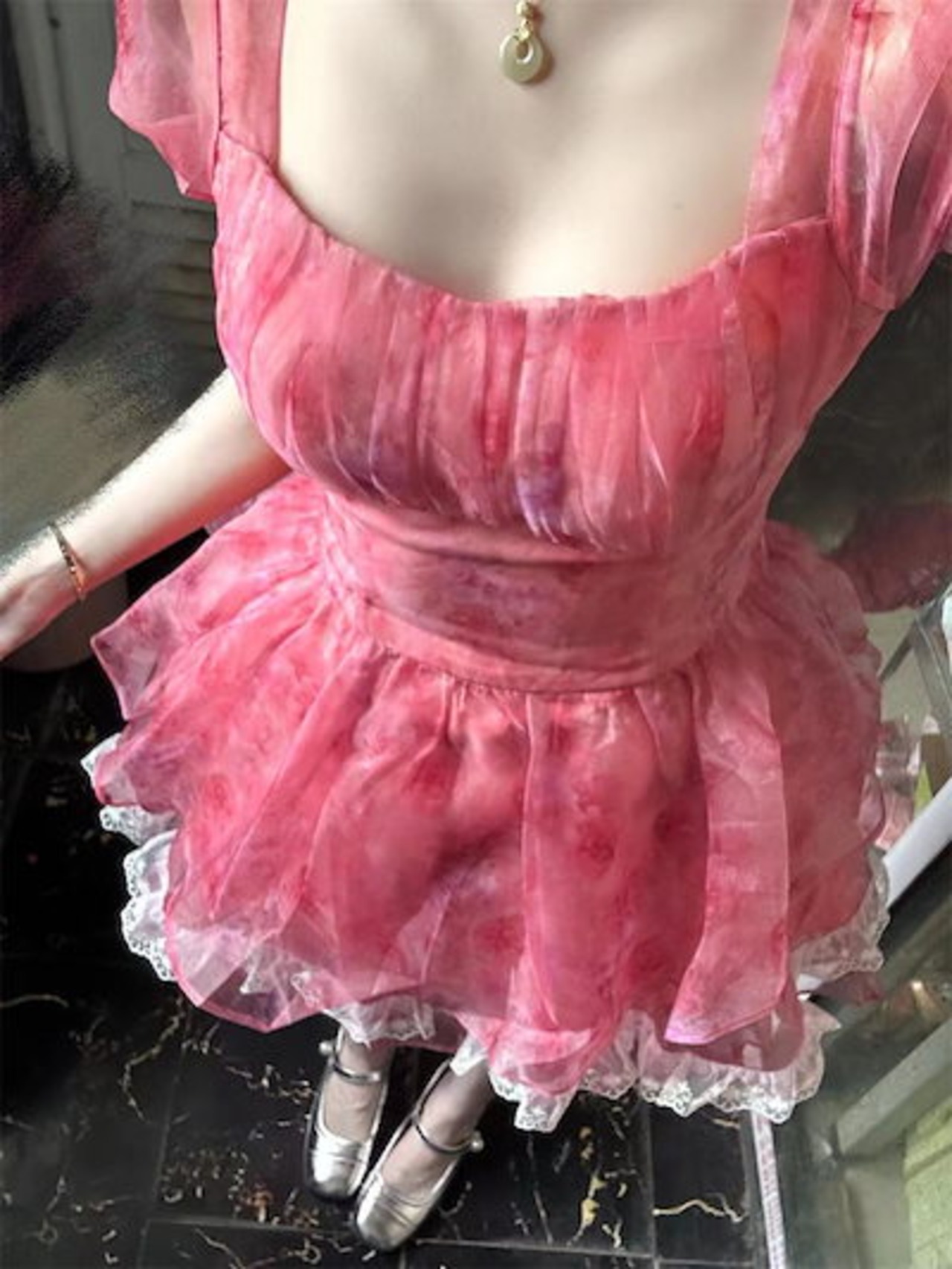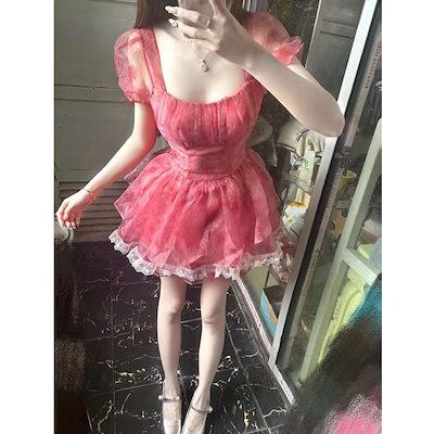 フレンチスイート風幻想的な白小花柄スリーブワンピース夏の新気品プリンセスポンポンスカート女