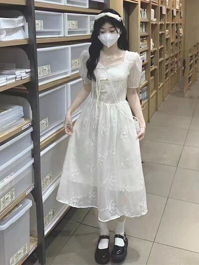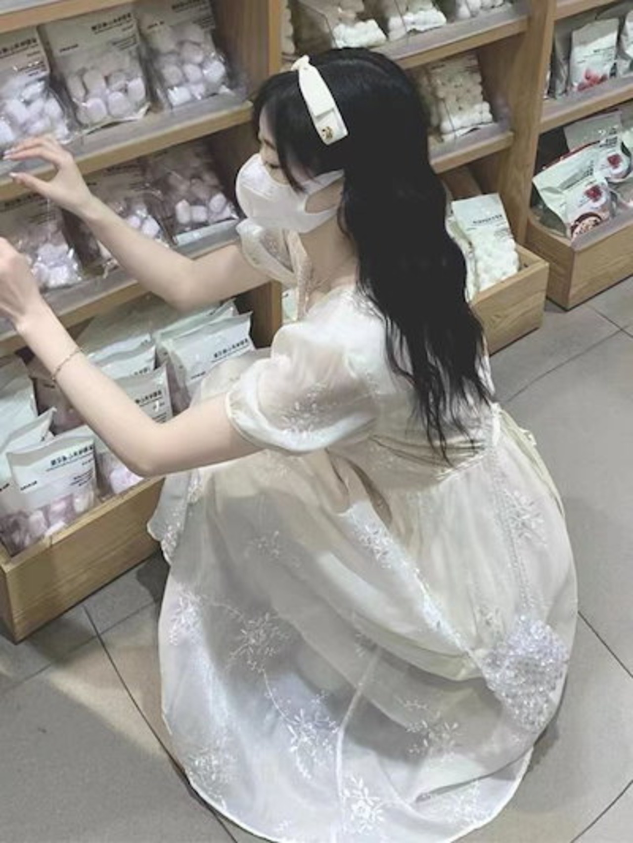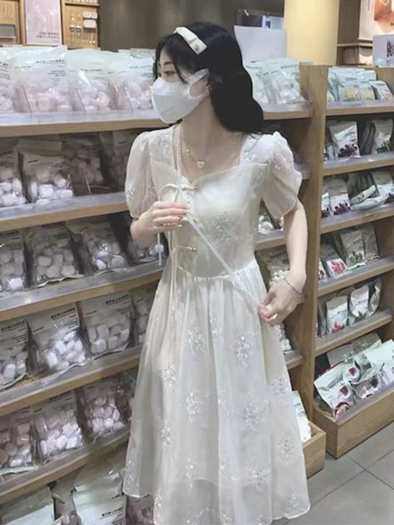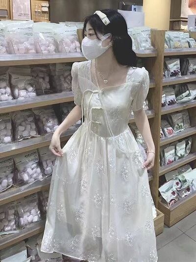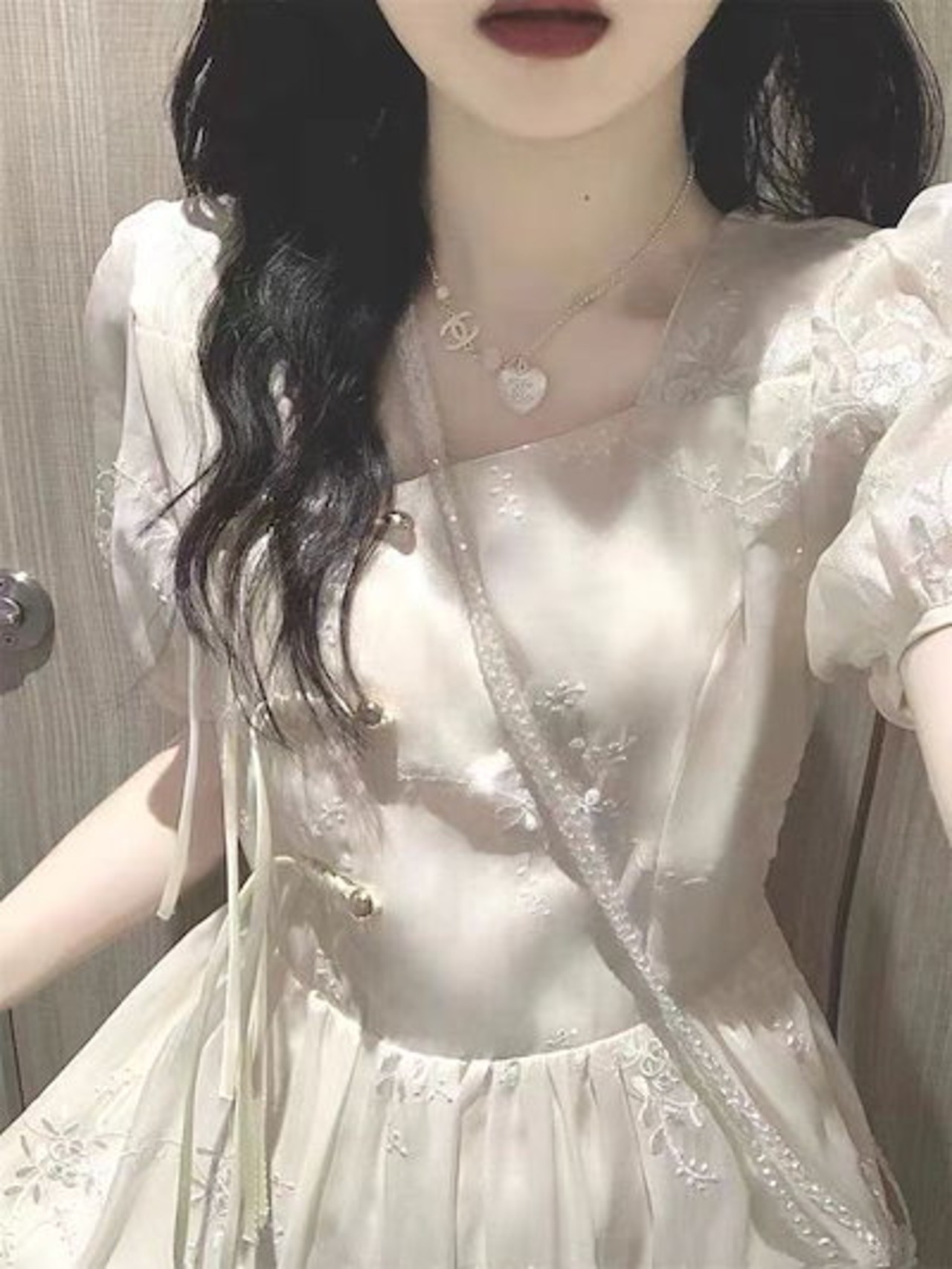新中式国風杏色ワンピース女夏小柄泡袖気質甘美仙女優しい初恋ロングスカート