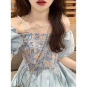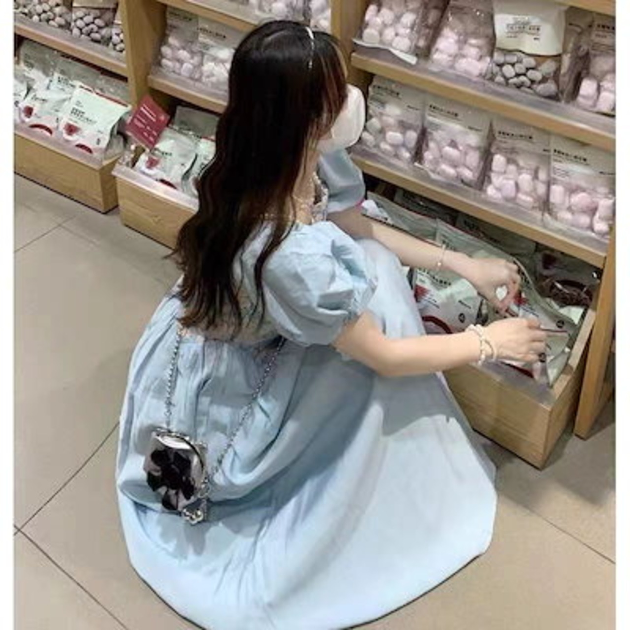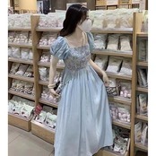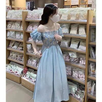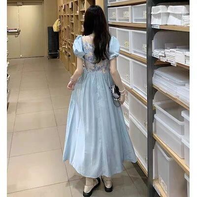 フレンチ初恋の方ネックジャカードスリーブワンピース夏の高級感気質ウエストを収めて細く見えるプリンセスロングスカート