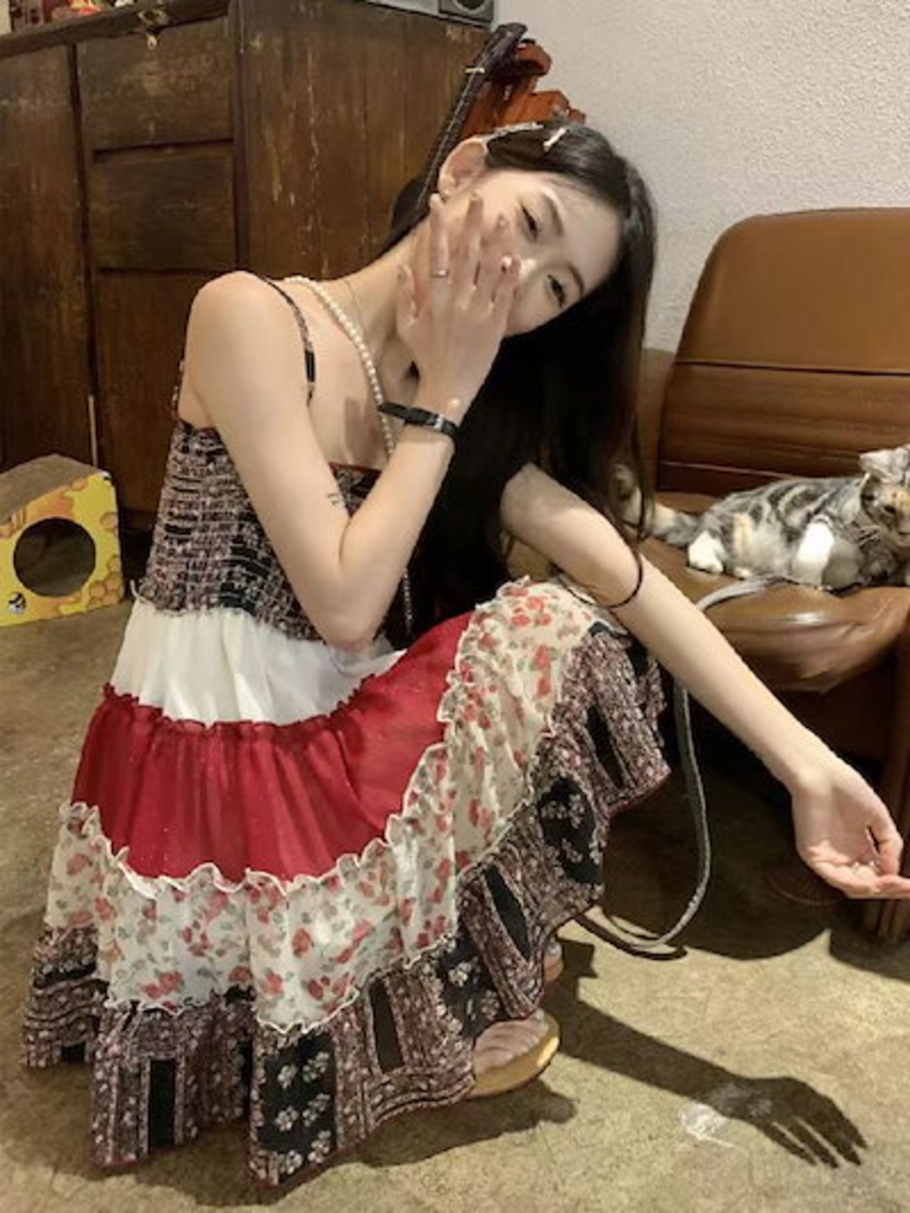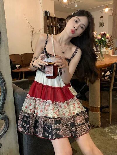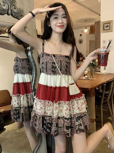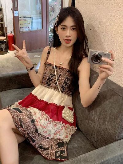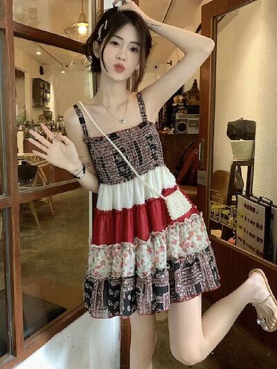 2024新作スカート夏のレトロな雰囲気の花柄キャミソールワンピース小柄なパッチワークシフォンキャミソールスカート