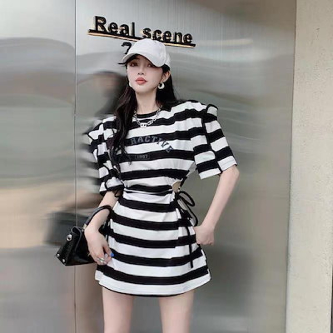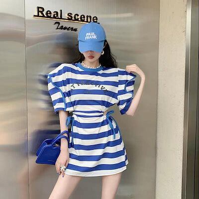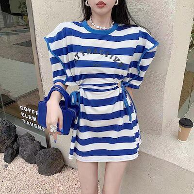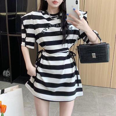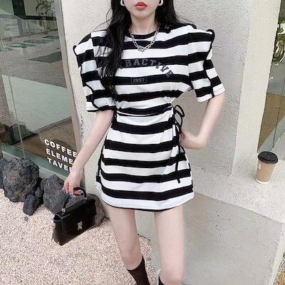 ストライプの泡半袖ワンピース女性デザイン感小人数夏の新作シックな高級感ギャルウエストスカート