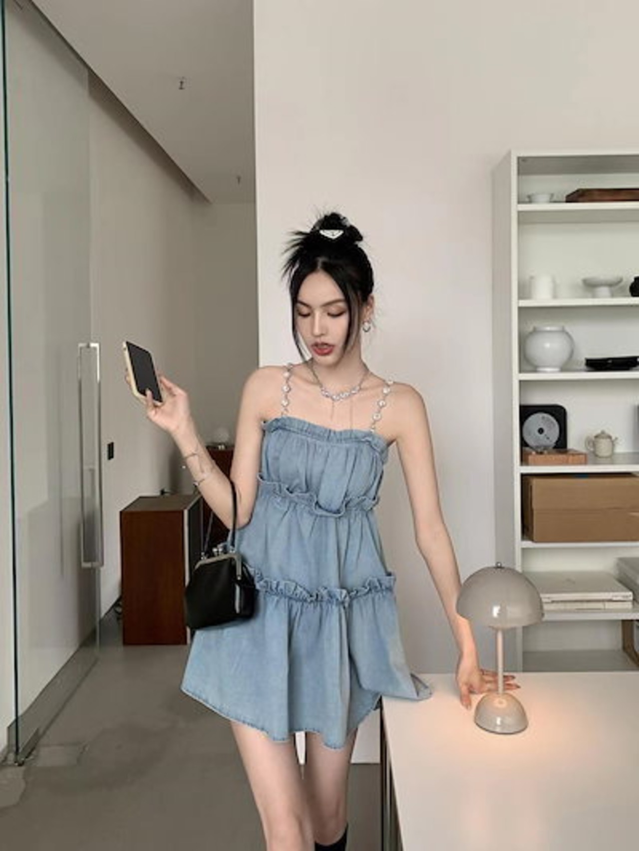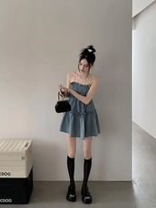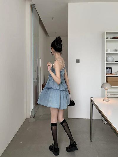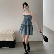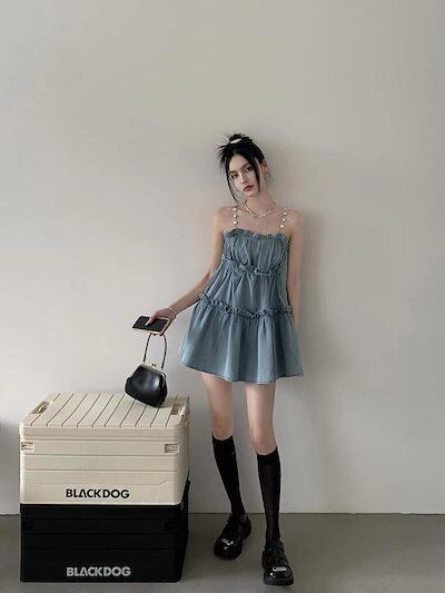 夏のギャルカレッジ風減齢森ガールデザイン感小柄肩出しキャミソールデニムポンポンA字ワンピース