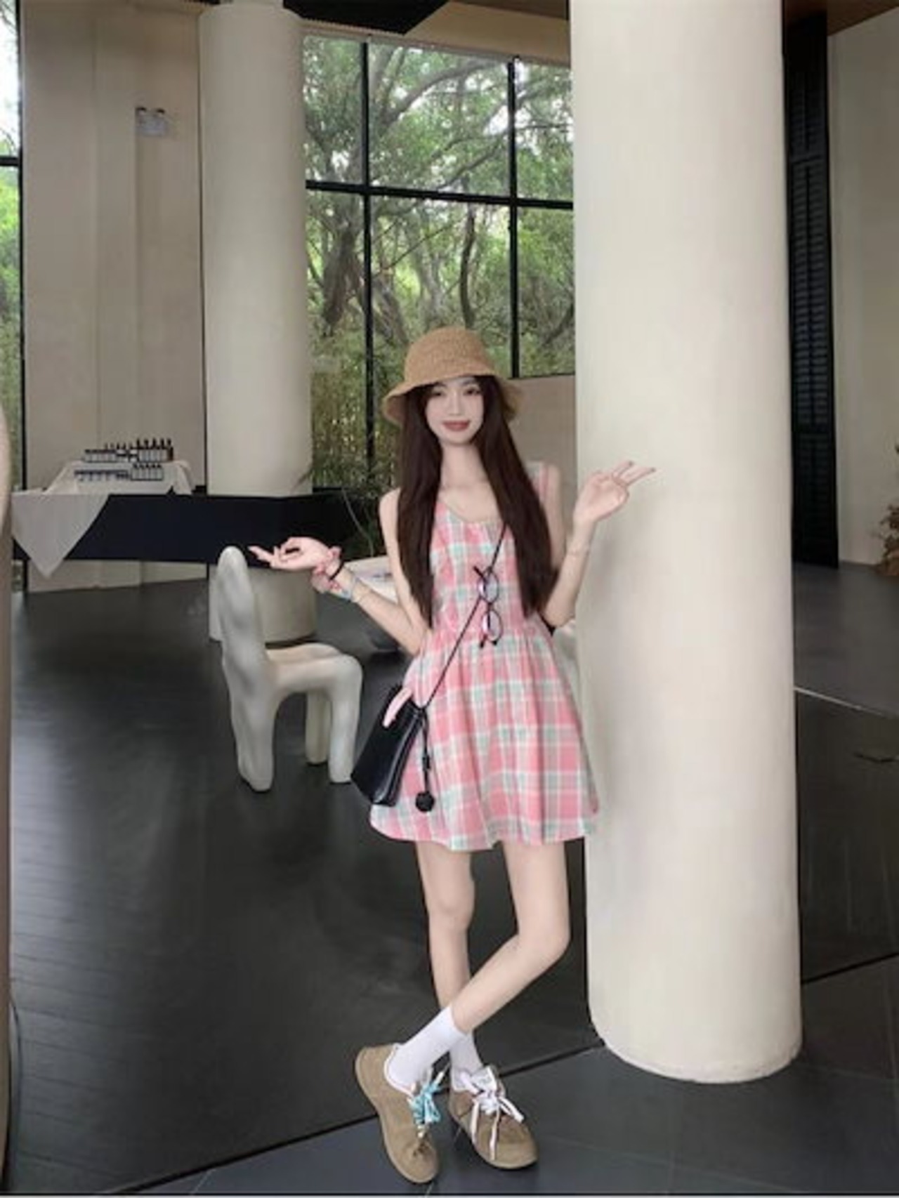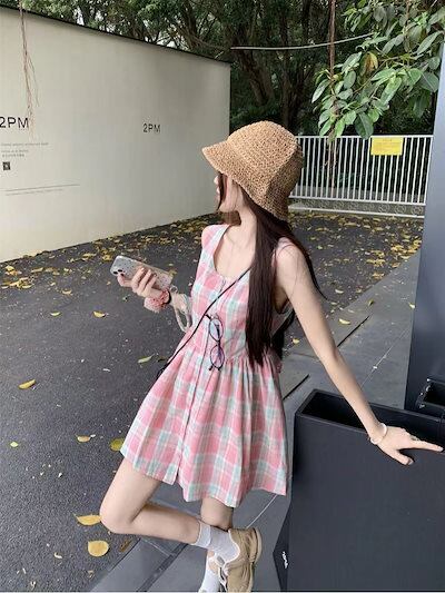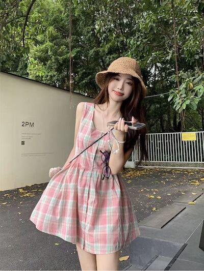甘め風ぶつかり色チェックのシングルブレストノースリーブワンピース女性夏は腰を収めて細く見えるA字スカート