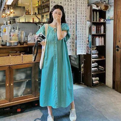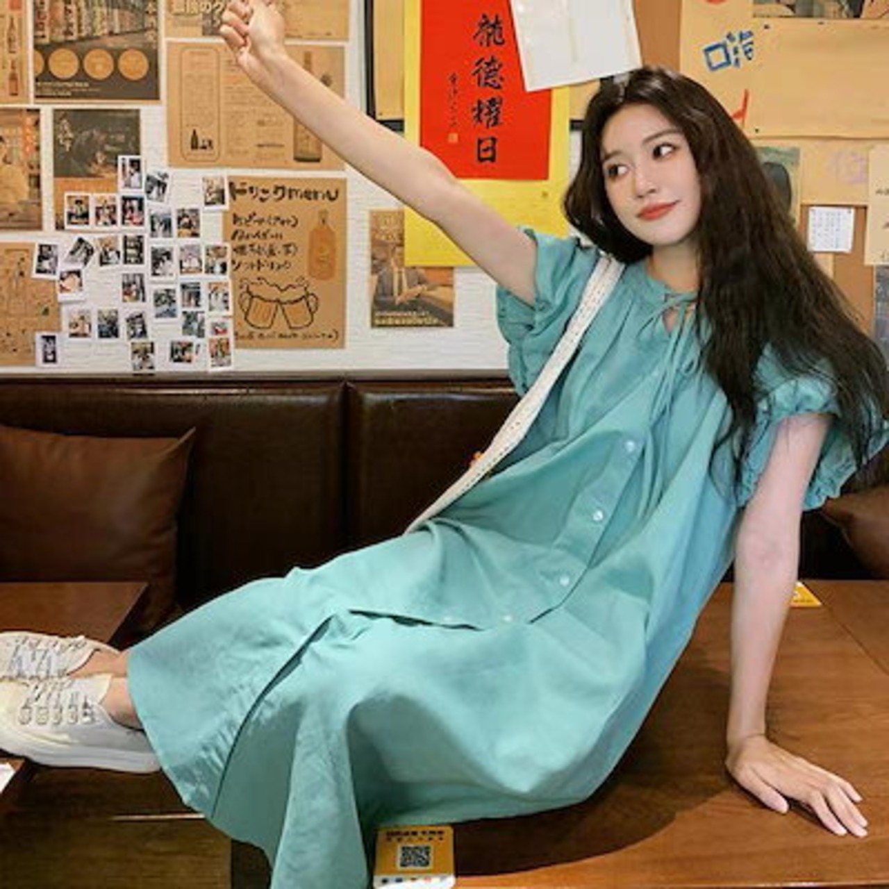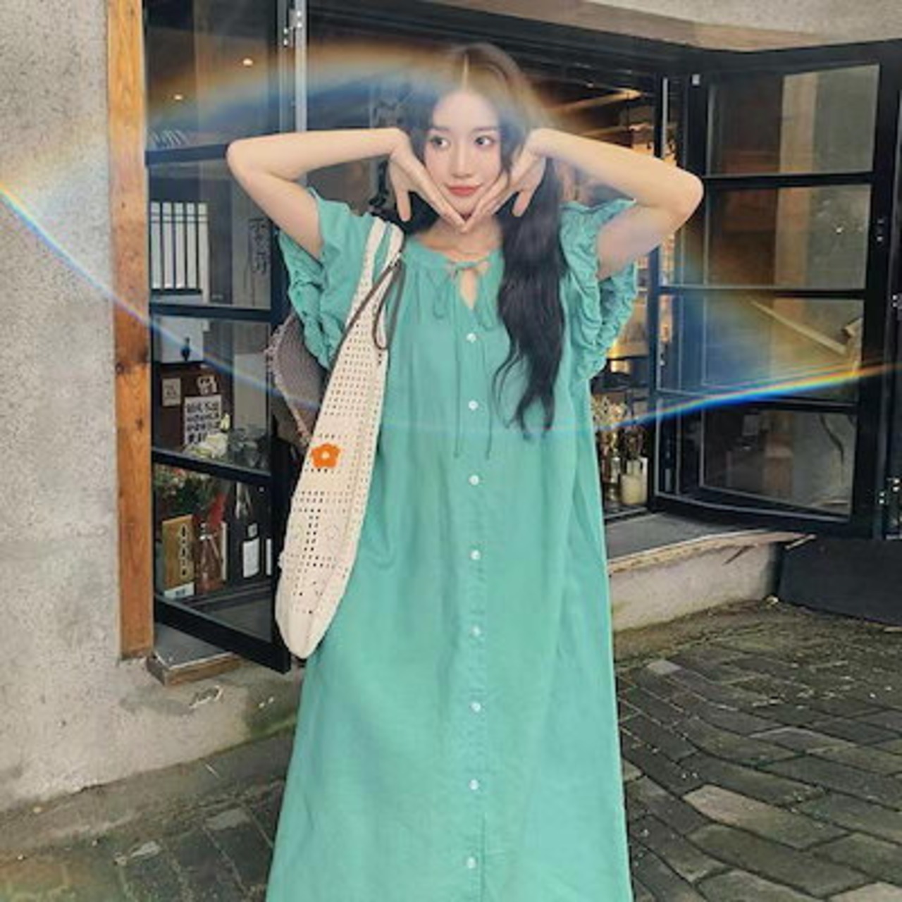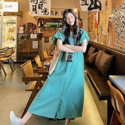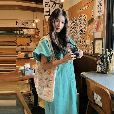ブルーグリーンのワンピース女性の夏2024新型フランスのだるい風Vネックの泡袖超きれいなリボンのロングスカート
