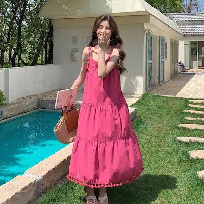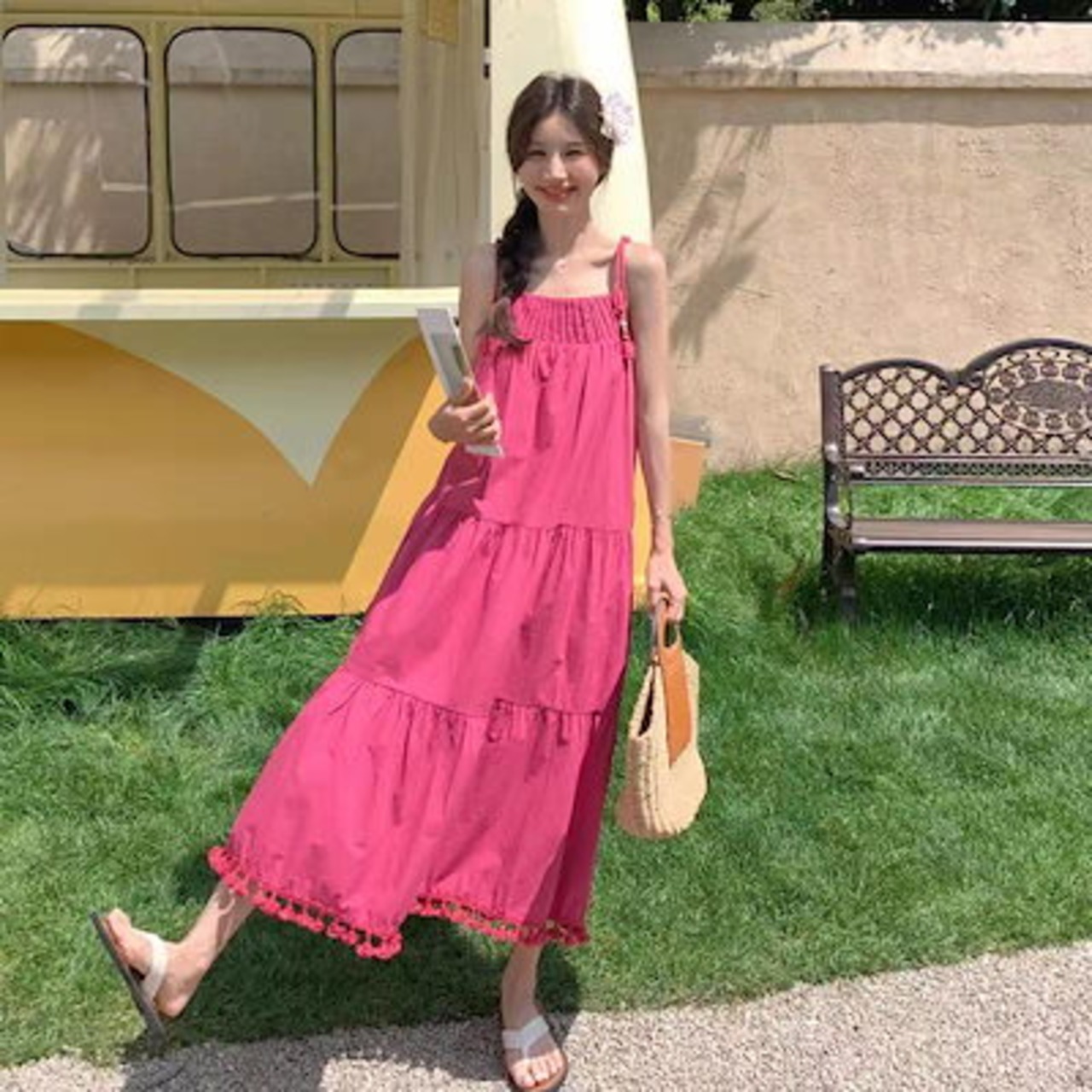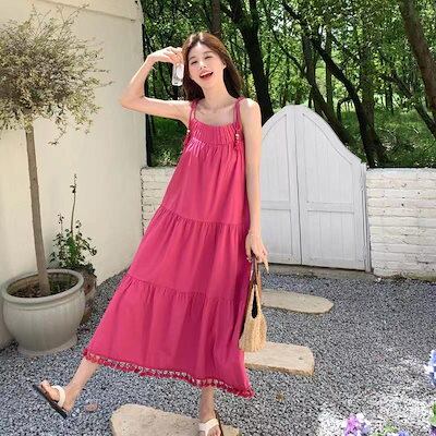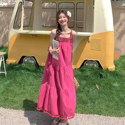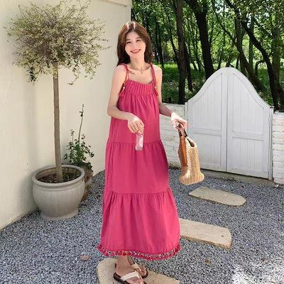 ローズピンクのキャミソールワンピース女2024新海辺リゾート超仙フリンジロングスカート