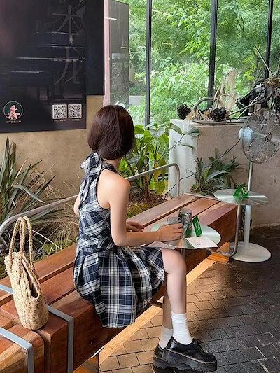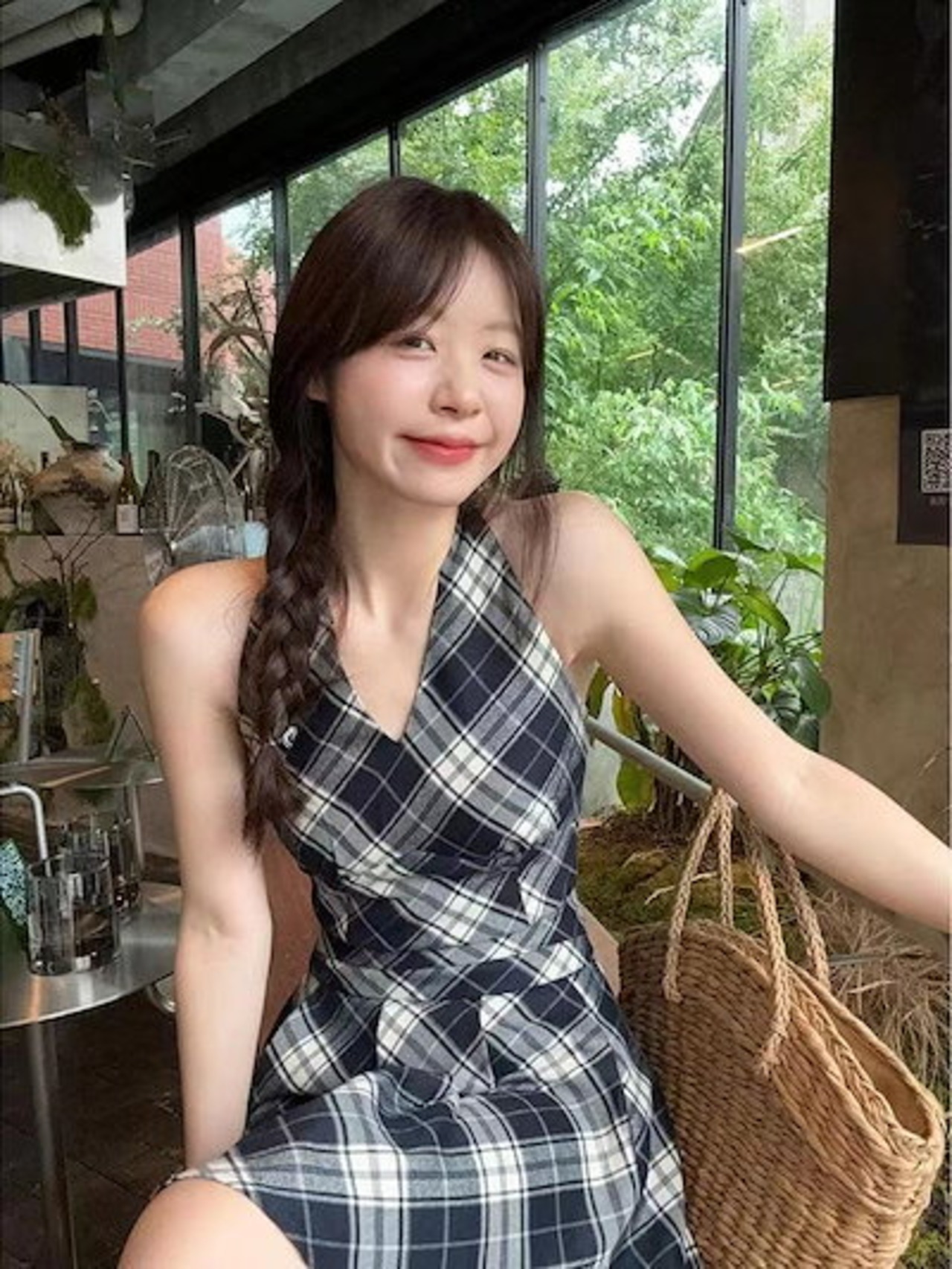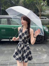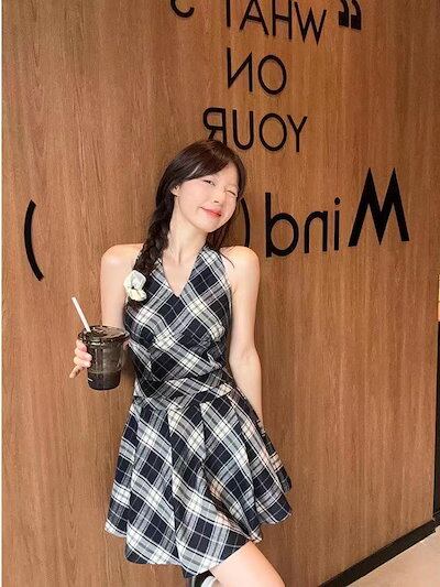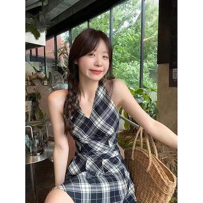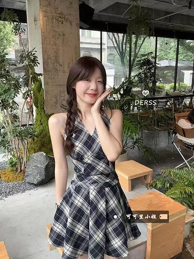 ギャルチェックの首掛けワンピース夏の新作ウエストを細く見せて小衆プリーツA字ショートスカートをつなぎ合わせるファッション