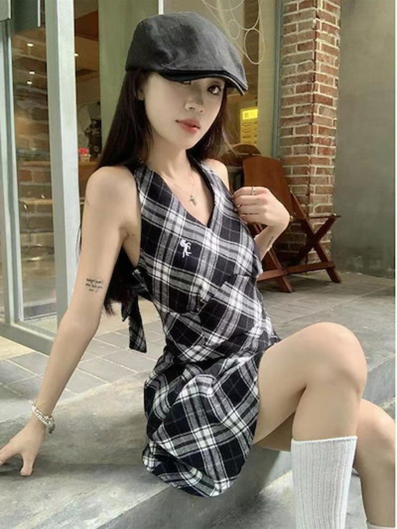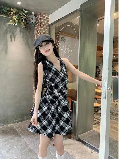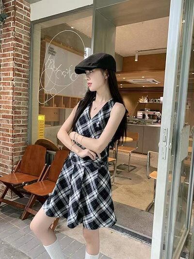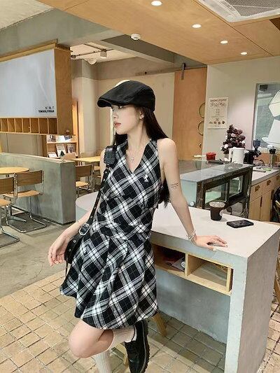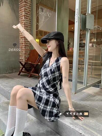 高級感のあるインパクトカラーのチェックA字ワンピース夏の新作ギャルベルトで痩せた首かけタンクトップミニスカートファッション