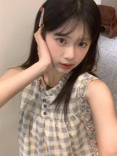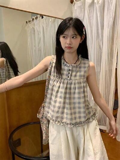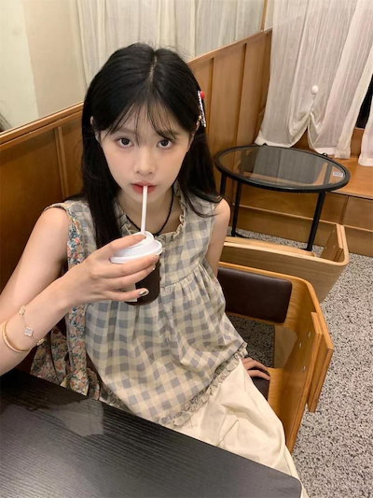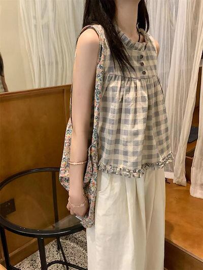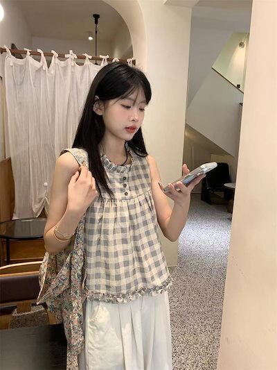 木耳元チェックノースリーブブラウスレディース夏2024新作甘め風ゆったりカジュアル減齢デザイン感トップス