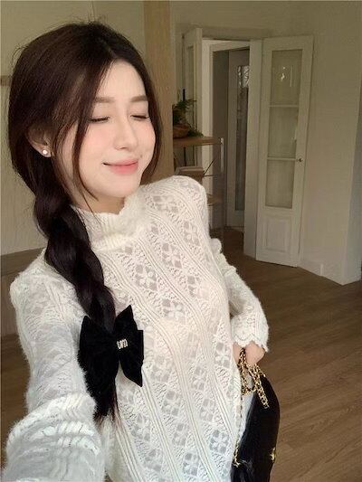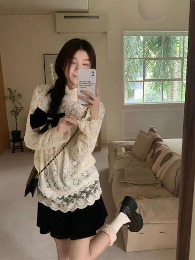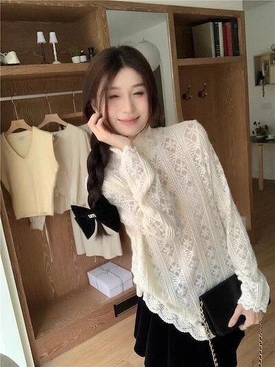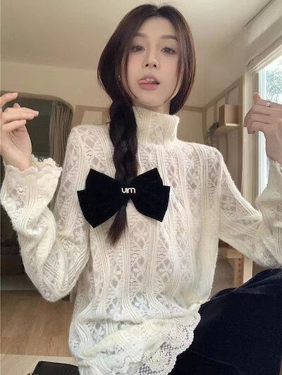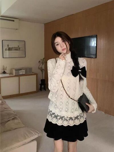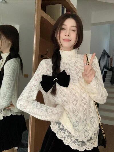 優しげな雰囲気のオールインワンハイネックレースブラウスレディース春2024新作ゆったり着やせタイツトップス