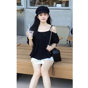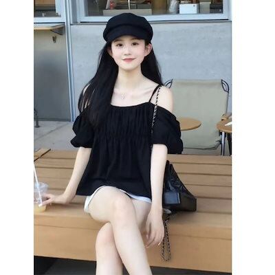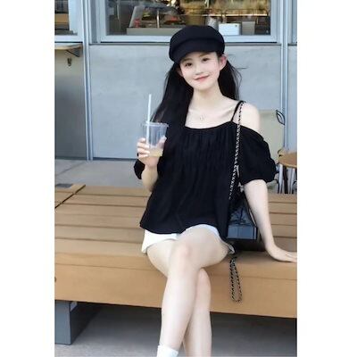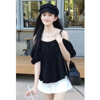 純色キャミソールブラウス女2024夏新作フレンチ一文字襟トップスゆったり肩出し半袖シャツ