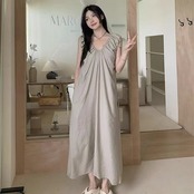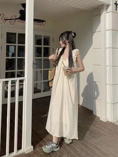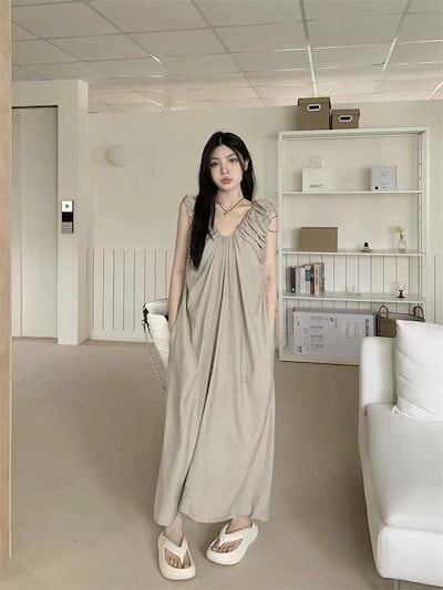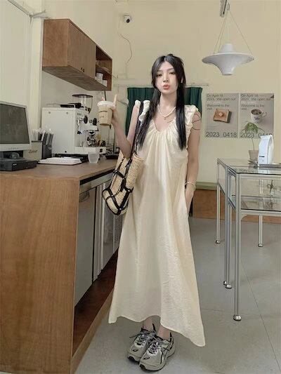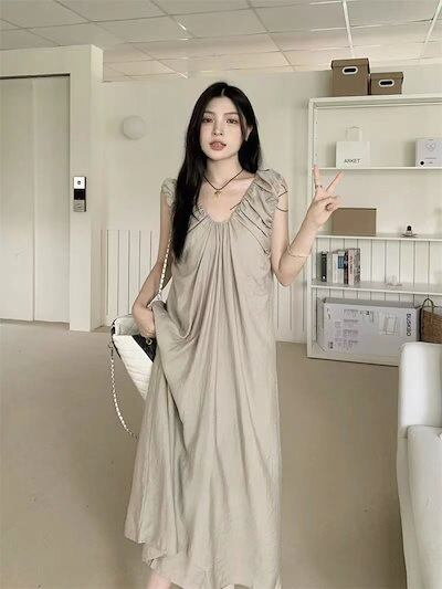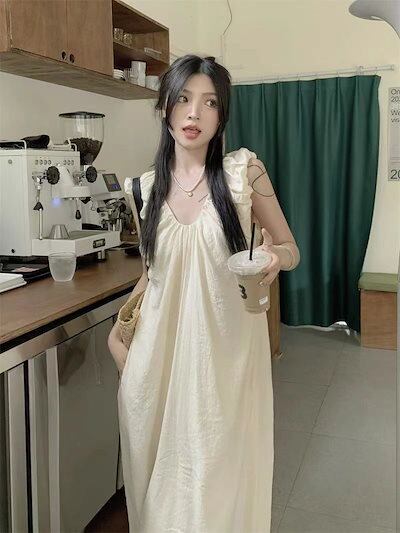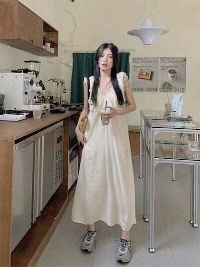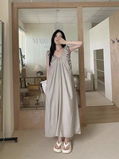 優しげ風キャミソールワンピース女夏2024新フレンチミニマルデザインプリーツゆったり雰囲気ロングスカート