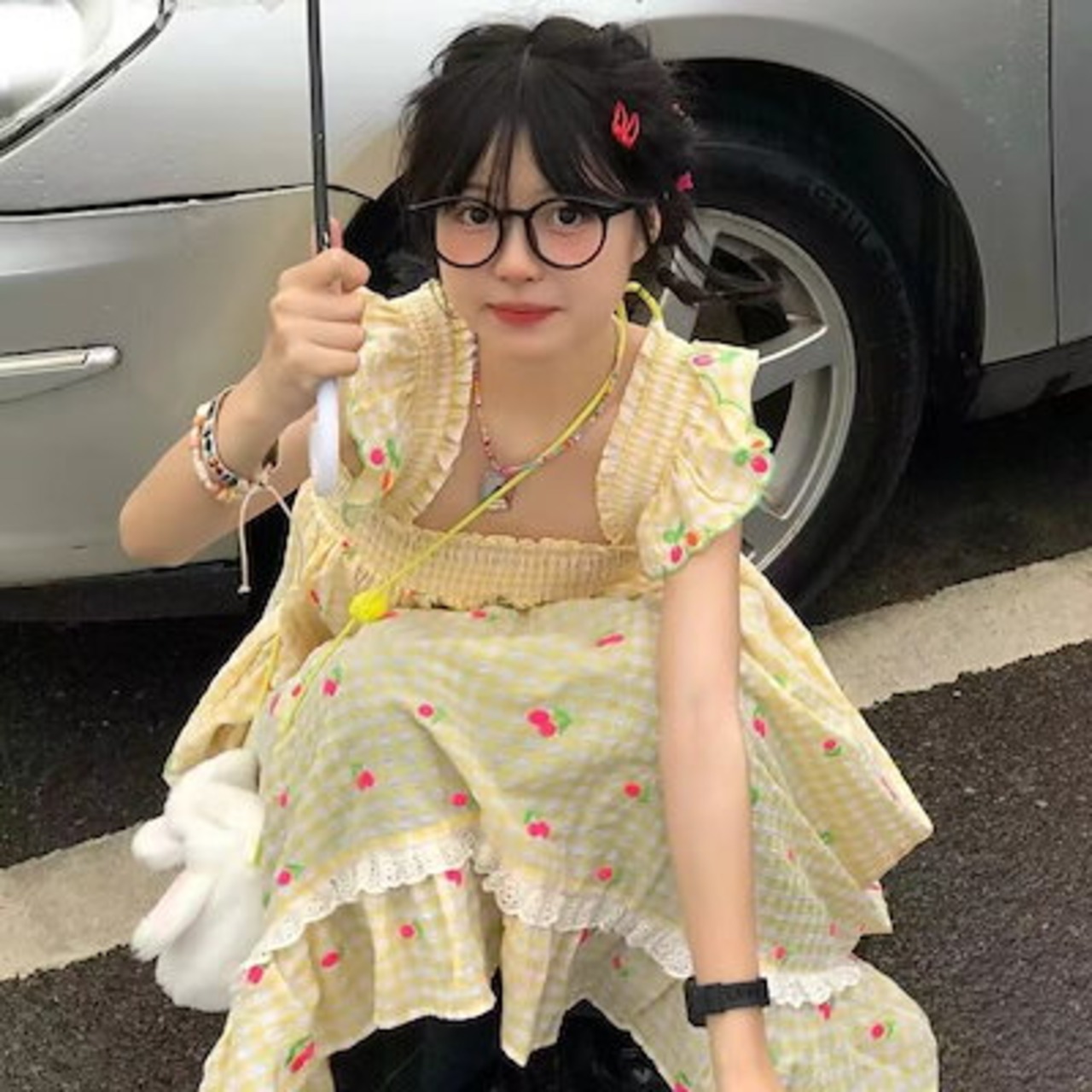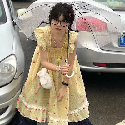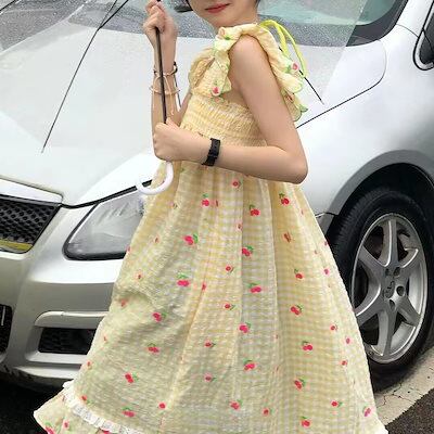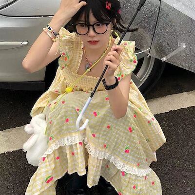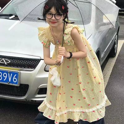 フレンチスイート風ロングスカートピュアなデザイン感チェリープリント2024新作フライングスリーブミニワンピースins