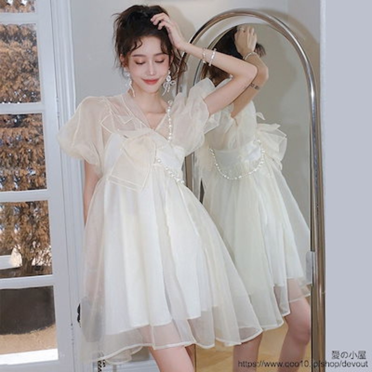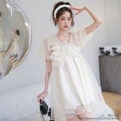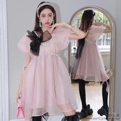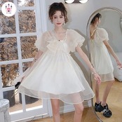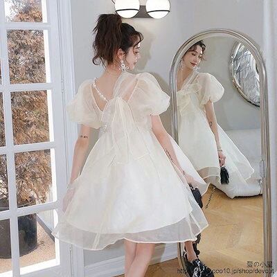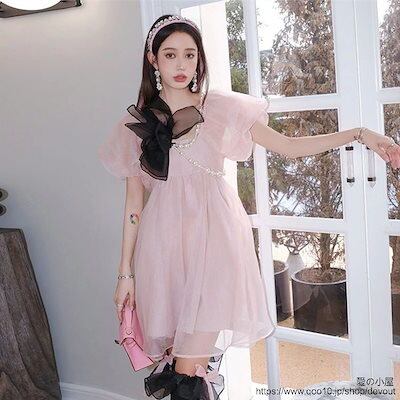 超仙は逃げているプリンセススカート夏女小柄で甘いリボンの泡袖パールチェーンワンピース