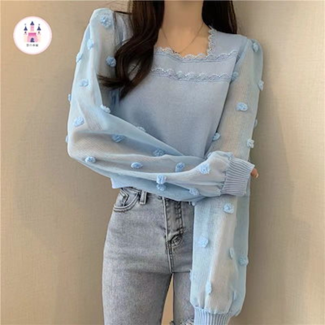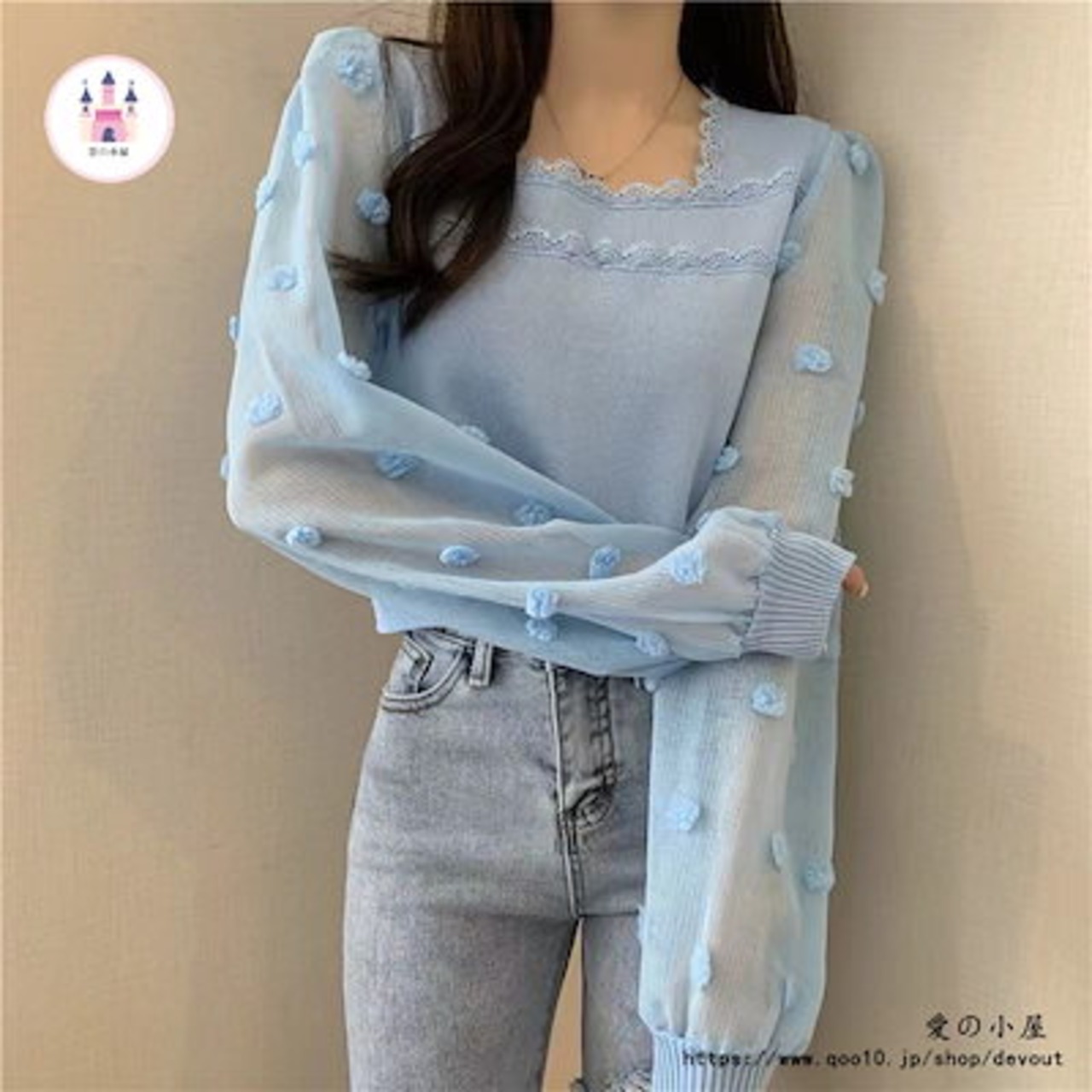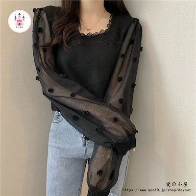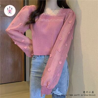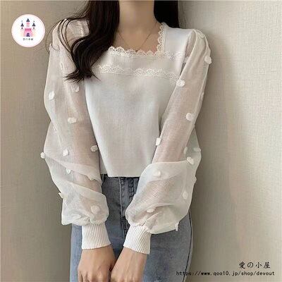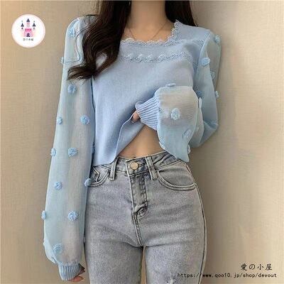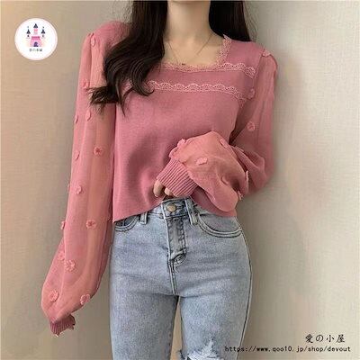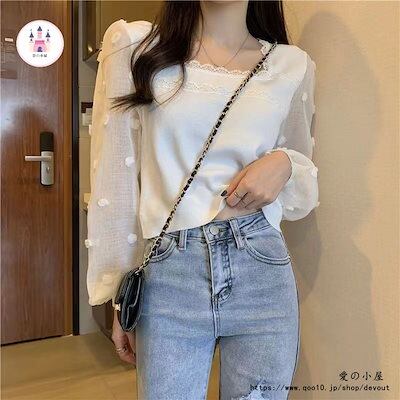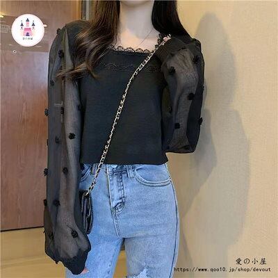 小柄ショート丈スクエアネック鎖骨フリルニットレディース春秋新作シフォンパッチワーク春シャツ