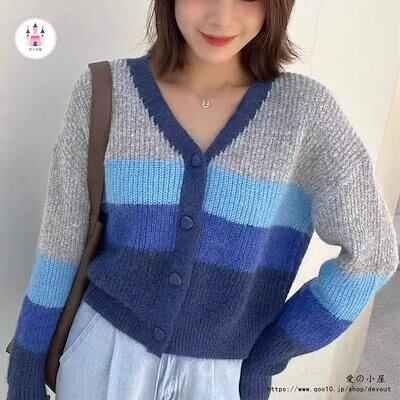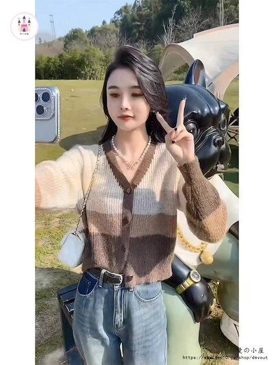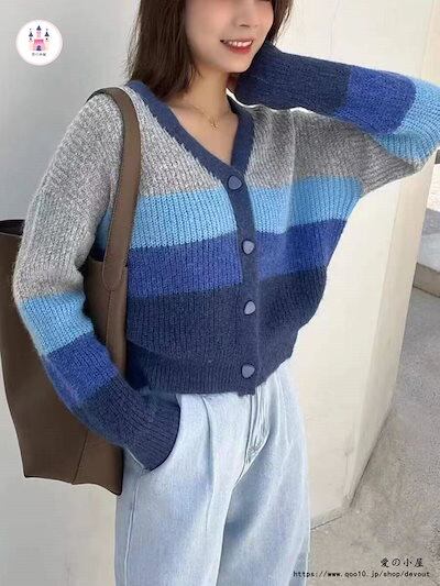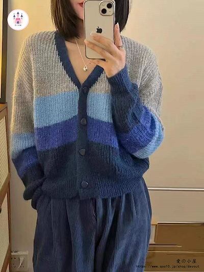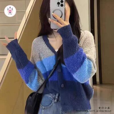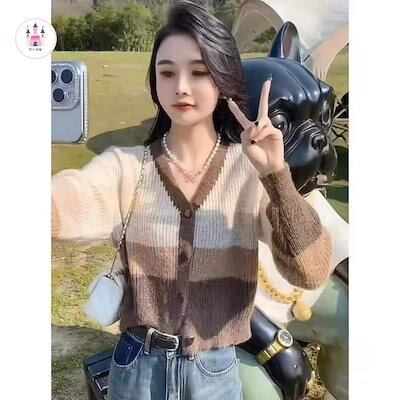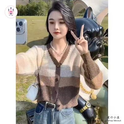 ストライプのパステルカラーのモチモチセーター女2024春デザイン感小人数レトロVネックカーディガンショートコート