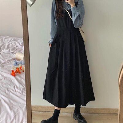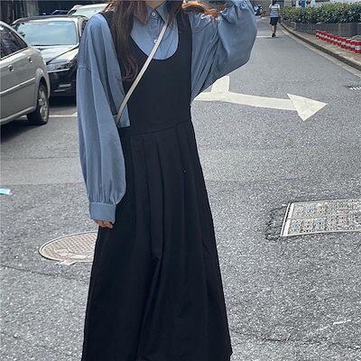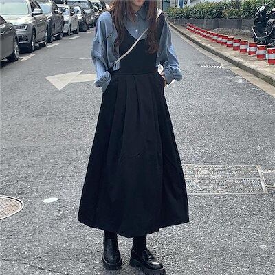 韓国ファッション 春秋 おしゃれ 長袖 セット 着痩せ サロペットスカート可愛い 二点セット ロング ワンピース 二点セット