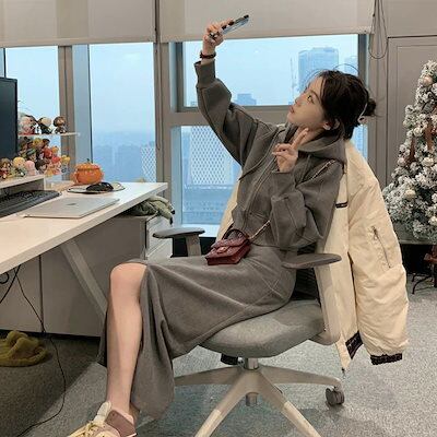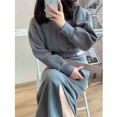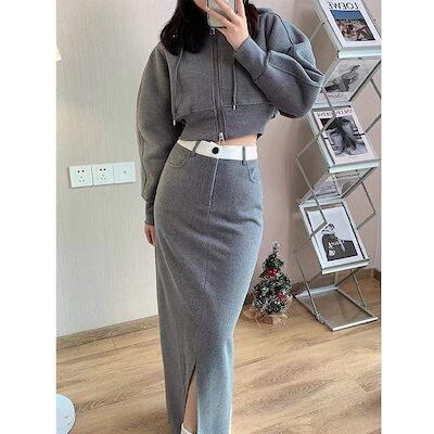 韓国ファッション 春秋 長袖 セット フード付き スウェット 着痩せ スカート 二点セット