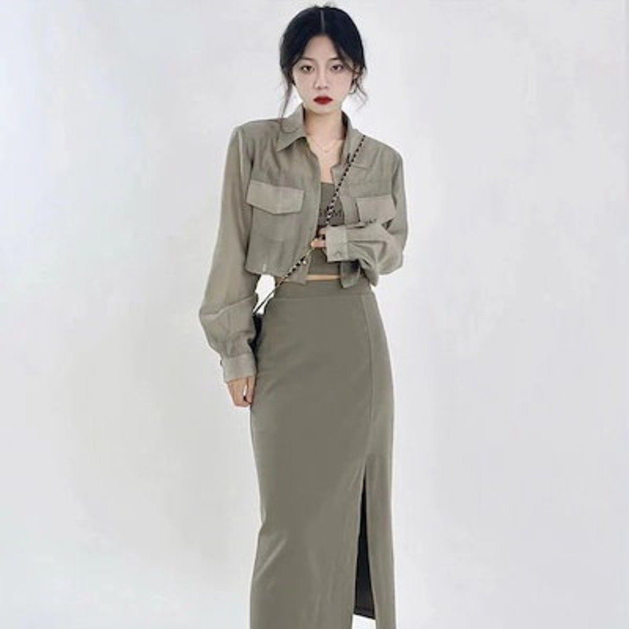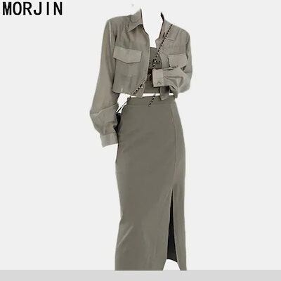 韓国ファッション 春秋 カジュアル 長袖 セット キャミソール おしゃれ 着痩せ スカート 三点セット