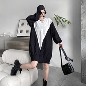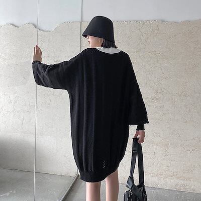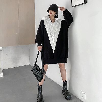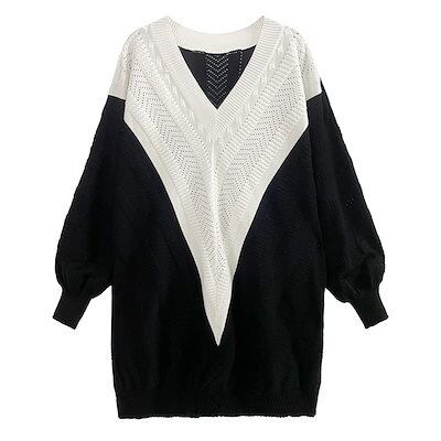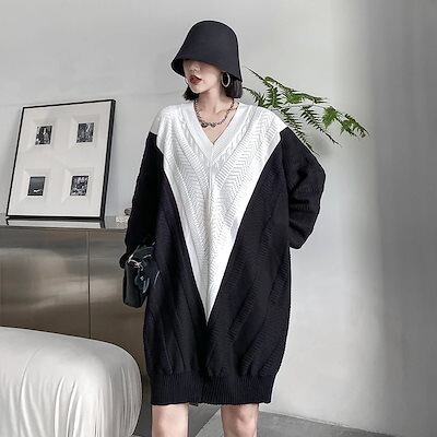 新作 おしゃれ カジュアル ワンピース 気質 Vネック コントラストカラー ゆったり ニットワンピース ロングワンピース