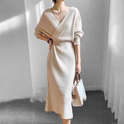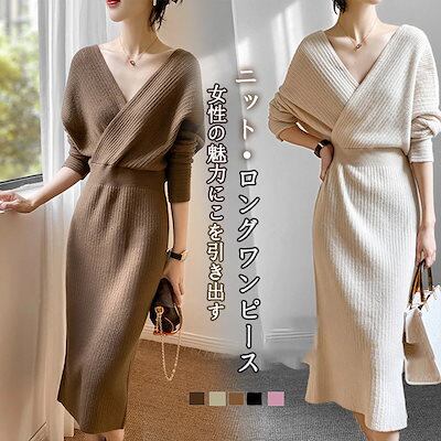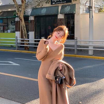 【2枚購入で 3oo円OFF!】新作 おしゃれ 気質 ワンピース Vネック 長袖 ウエスト引き締め ニットワンピース 通勤
